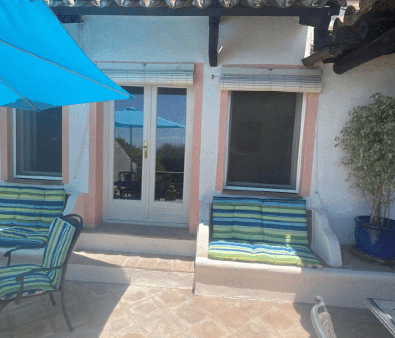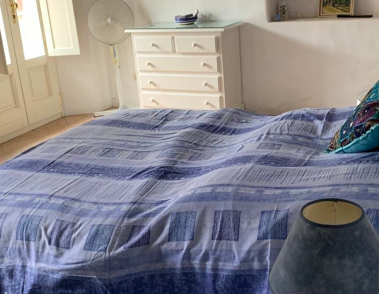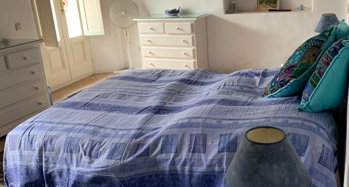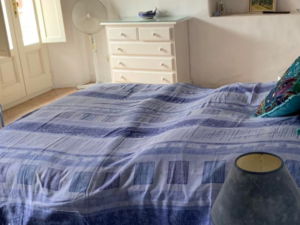 First Floor — The Blue Bedroom is fully furnished with a double bed and bedroom storage chests. There are two double wardrobe’s and an en-suite bath, separate shower, toilet and wash hand basin. This bedroom has double doors to a large terrace with fabulous views. In the passageway between the two bedrooms is a large linen storage cupboard.