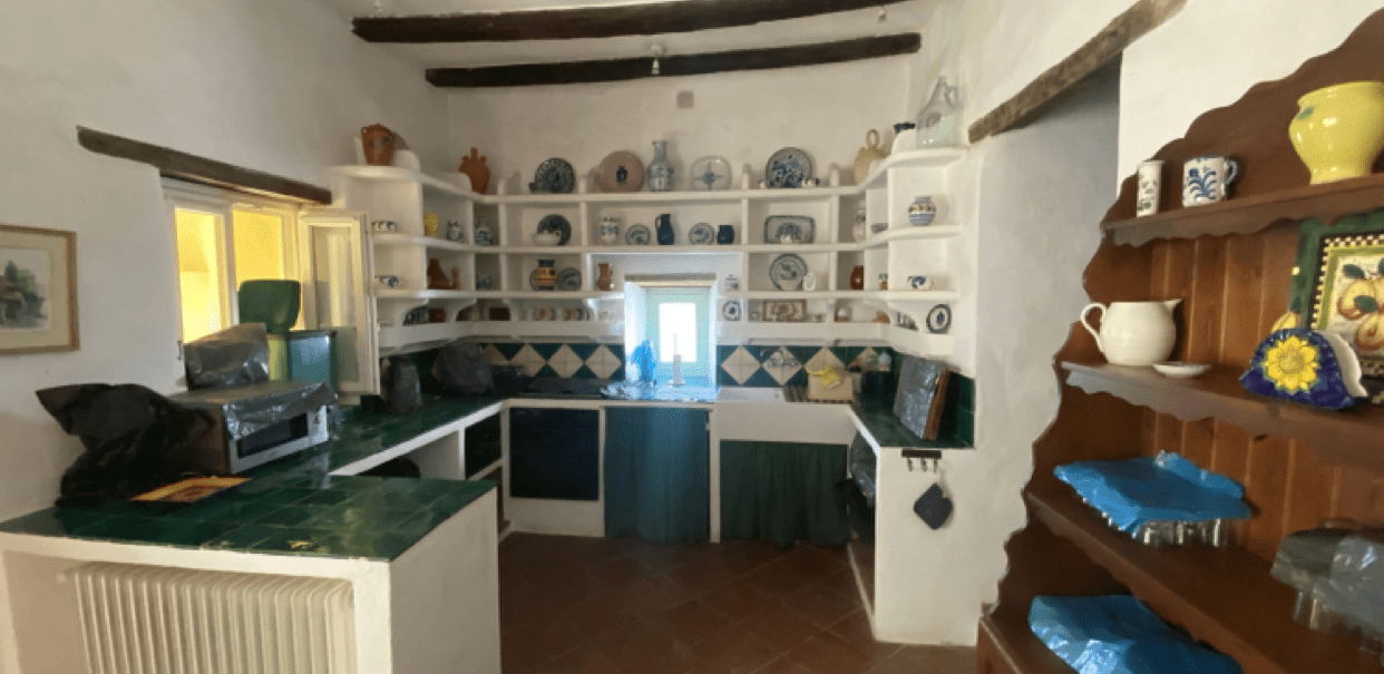 Middle Floor — This floor consists of a spacious day room with a seating and dining area and a wood burner and doors to the front of the house and others to the main terrace. A large full fitted kitchen and separate walk-in pantry all with plenty of storage and shelving. Towards the back of the house is a good sized utility room with a washer, dryer and central heating boiler, and a cloakroom with a toilet and hand basin. There is a small rear courtyard that houses the solar equipment and a water softener.