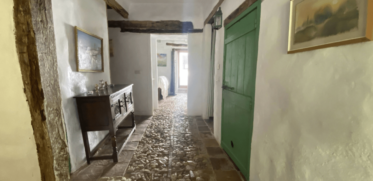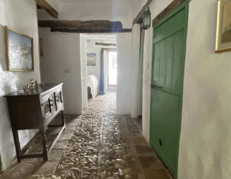 From the dining room, a passageway leads to a downstairs cloakroom with toilet and washbasin and stairs to the second floor. The passageway has a cobbled donkey track floor as it was originally part of the old mill working, where donkeys entered the complex. This Passageway leads to the sitting room that has a wood burner and furniture, tables etc . There are large very old double wooden doors and also glass double doors leading out onto the street.