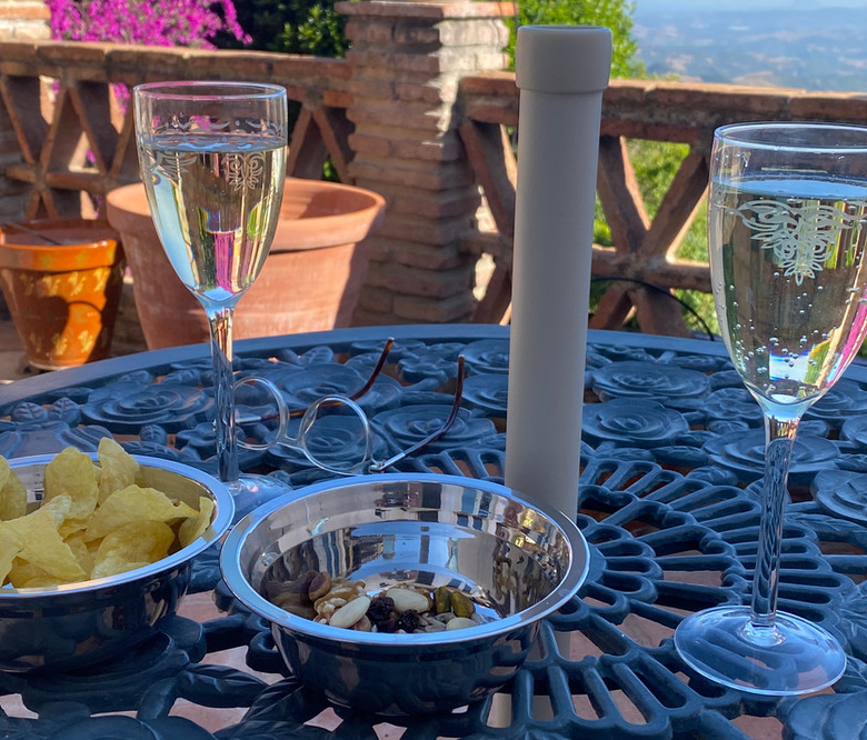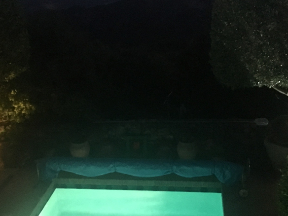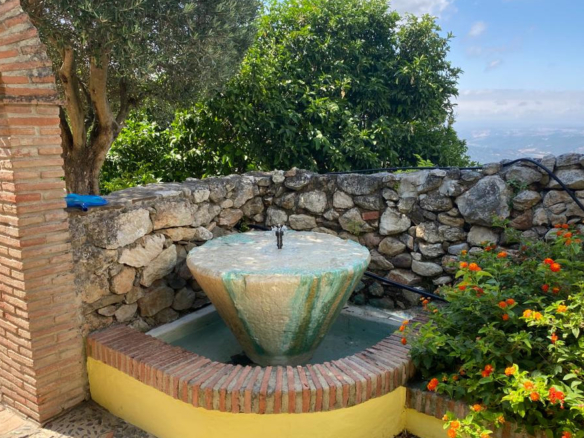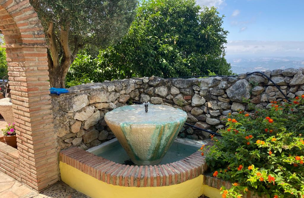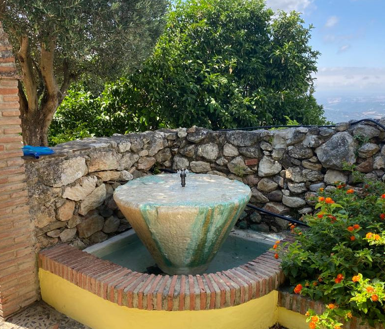 Continuing on this terrace there is an arch leading to another cobbled terrace with a fountain being the other half of the old mill grindstone. There is a small garden storage shed on terrace, and outside steps leading to the second house…