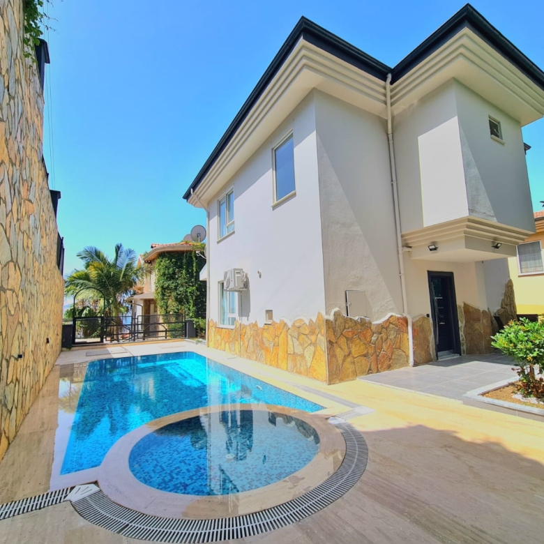 Private villa for sale in Alanya – This private villa for sale in Alanya is a modern 2+1 duplex located in the peaceful Bektas area. The villa offers 130 m² of living space on a 250 m² plot, featuring an open-plan American kitchen, two bathrooms, and a brand-new interior design. The highlight of this property is its private swimming pool and breathtaking sea, castle, and city views, making it an excellent choice for both investment and luxury living.