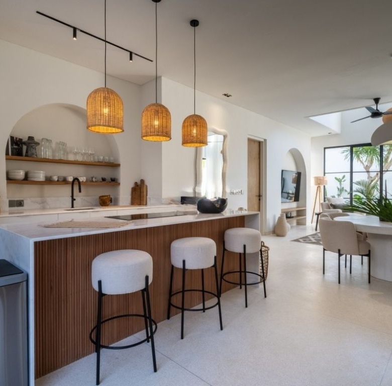 Set on 244 sqm of land with a build size of 172 sqm, the Modern Mediterranean villa consists of 3 ensuite bedrooms. The master bedroom is spacious with a good size balcony and large dressing room. The glamorous ensuite bathroom contains terrazzo bathtub, double vanity basins and quality black tapware. The villa also has a staff room and a carport. The interiors are designed and decorated by Tina Kirschner, leading international interior designer behind many successful villa projects both in Europe and Bali. The upmarket lighting concept is by a European lighting designer. The villa benefit from a 5-year structural warranty and a 1-year roof waterproofing warranty. The villa is built on elevated land as well as being north facing which allows for an abundance of natural light and ventilation with lots of all day sun around the 6.50 m x 2.5 m pool. Featuring strong galvanized steel French doors and windows, giving the ability for living areas to be fully enclosed for security and air conditioning or open for natural ventilation and indoor-outdoor living. A 6-metre-high void over the living room area adds to the natural light and spaciousness of the downstairs living area. The floors throughout the villa are polished terrazzo. Furniture package available upon request.