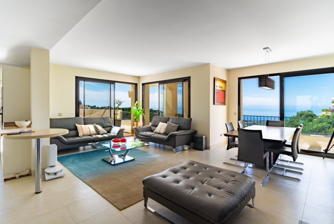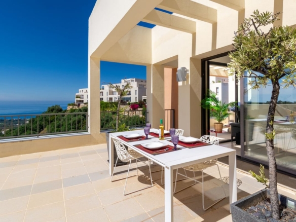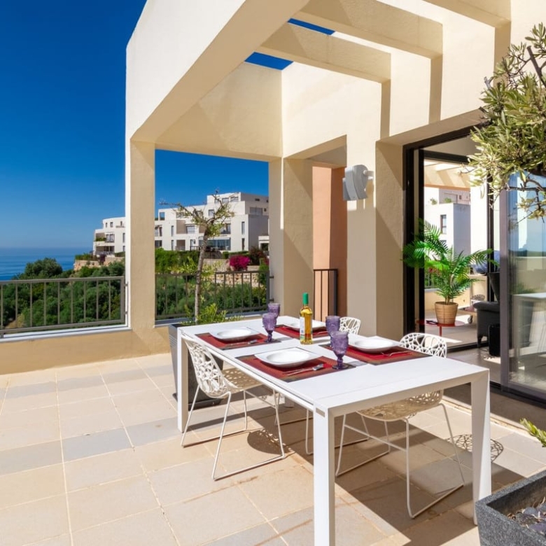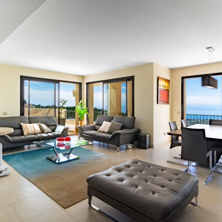 Driving up the hillside from the beaches of Marbella East, the views start to soothe the senses and prepare us for a tranquility like no other. Entering the resort through the 24 hour manned security gate, the driveway leads to the underground secure parking where there are no less than 2 designated parking places and a large storeroom for the Marbella Penthouse. Travel up from here in a lift that arrives on the landing right outside the front door to this property. On entering this home the views are the unmistakeable initial experience which are key to this type of property. Blue skies, panoramic open views to the Mediterranean and a huge wrap around terrace define the type of lifestyle that awaits you.
