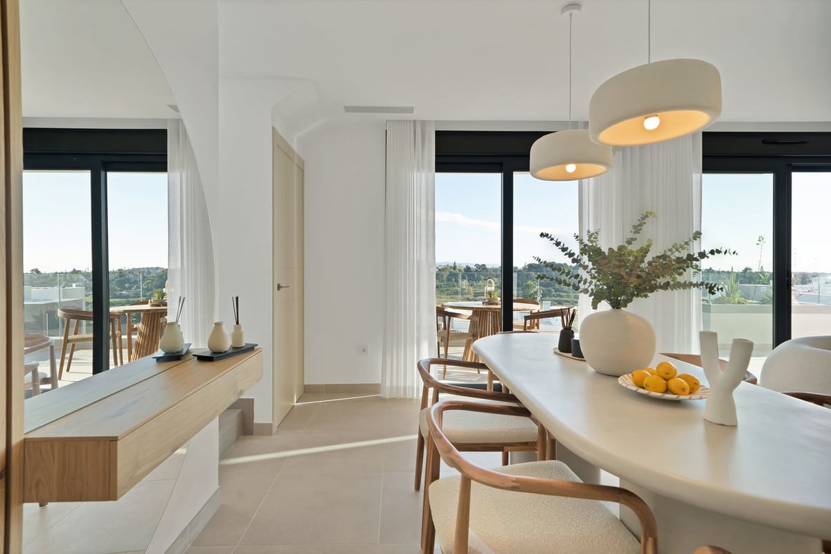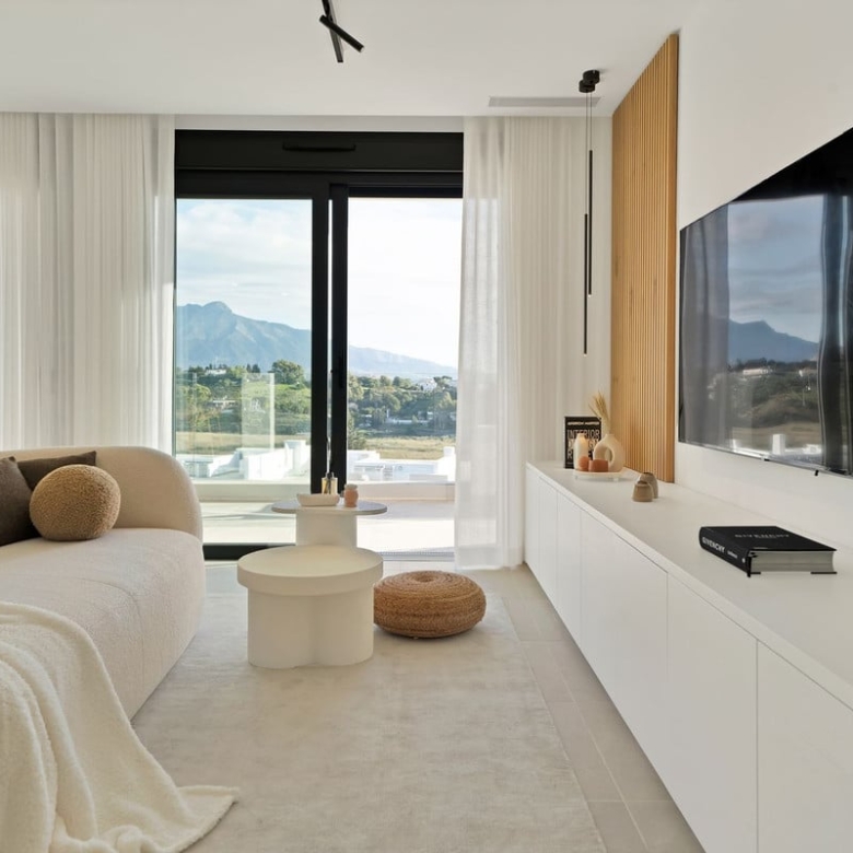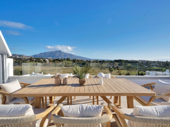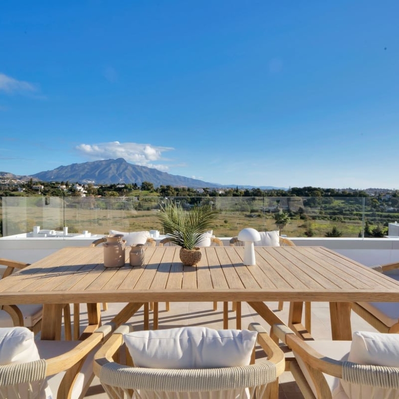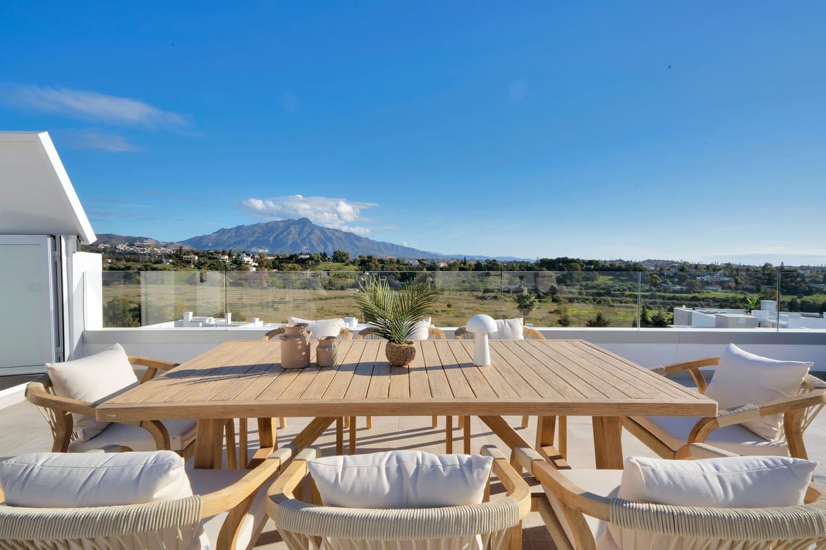 This luxury brand new penthouse in Atalaya Emotion, Estepona, features 3 spacious bedrooms and boasts a private terrace and solarium, offering breathtaking views of the surrounding landscape.