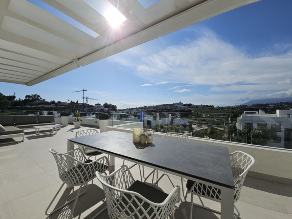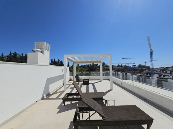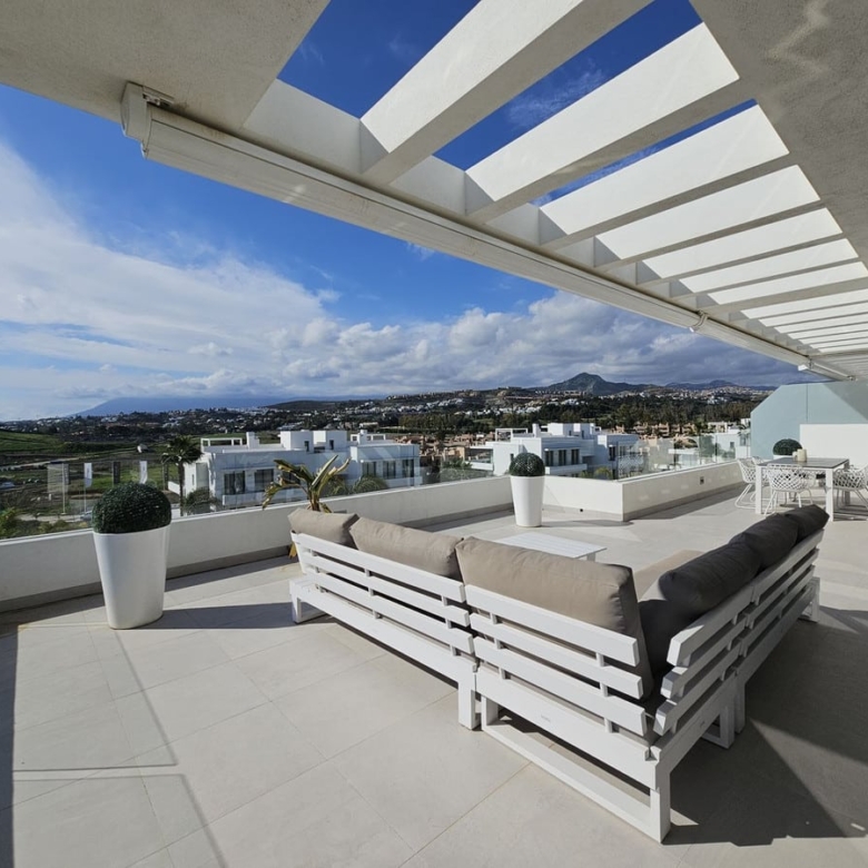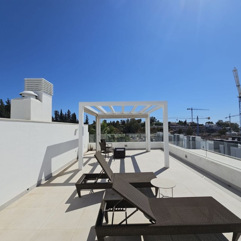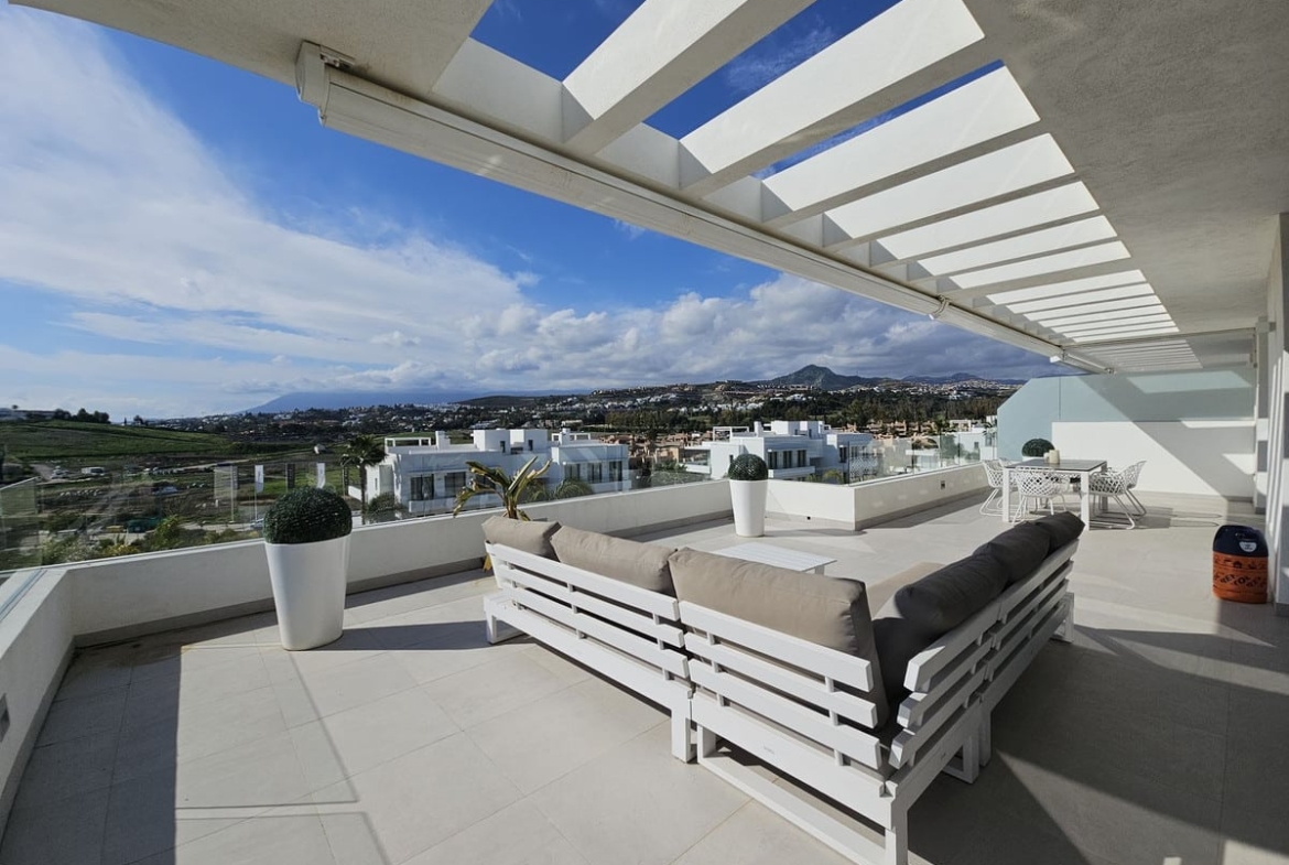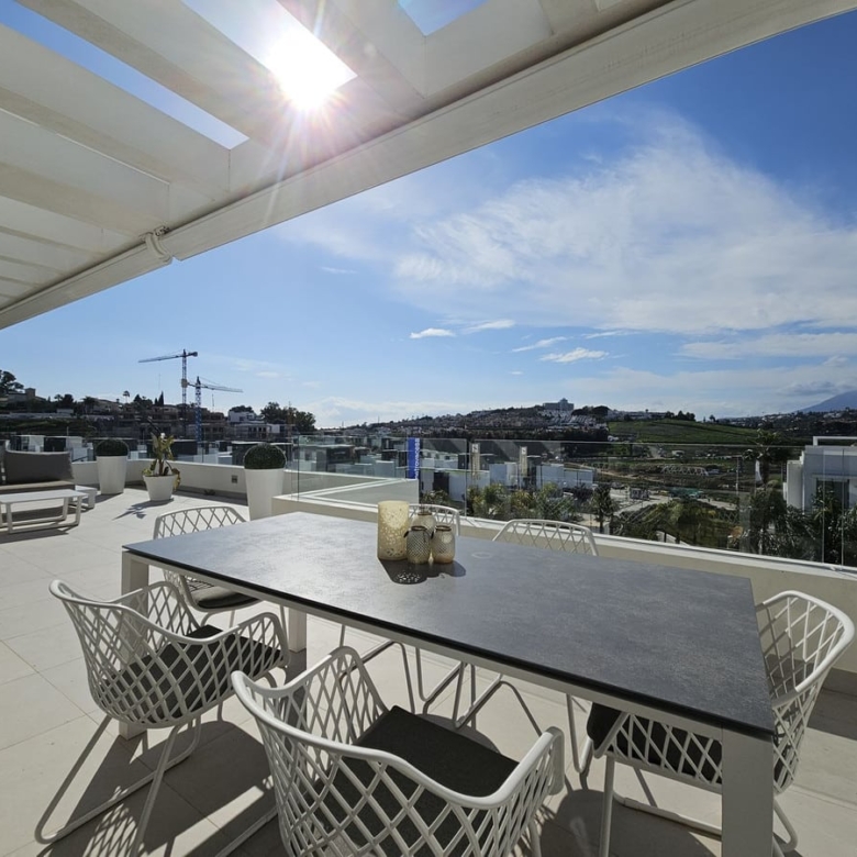 Nestled in this prestigious urbanisation, this luxurious 3-bedroom duplex penthouse offers the perfect blend of modern comfort and outdoor living. Spread over two levels, the property boasts spacious interiors, a large private roof solarium with breathtaking views, and access to premium communal amenities.