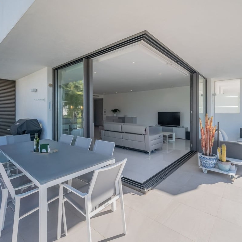 This brand new, modern apartment features a spacious open plan design with top quality finishes throughout. The bright and spacious living-dining room flows seamlessly into the fully equipped kitchen, ideal for both everyday living and entertaining guests. Enjoy a fantastic private corner terrace that extends your living space to the outdoors, accessible from the living room through double glazed doors. it is the perfect place to dine al fresco, relax or simply enjoy the Mediterranean sun.