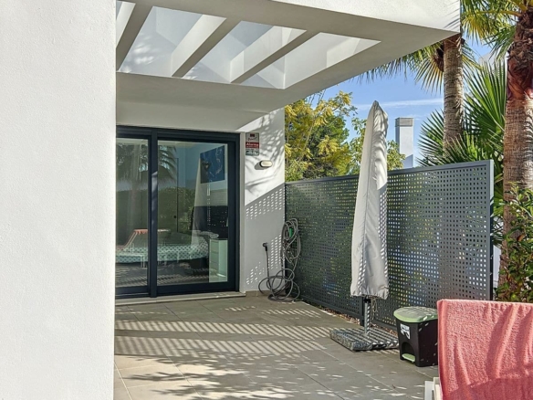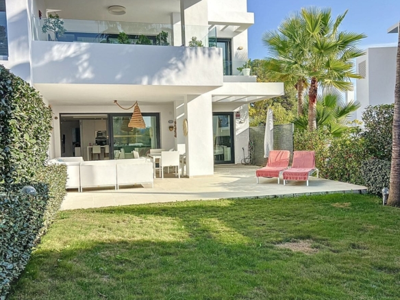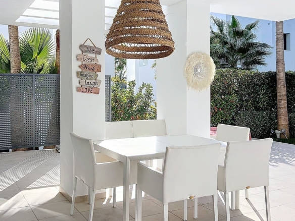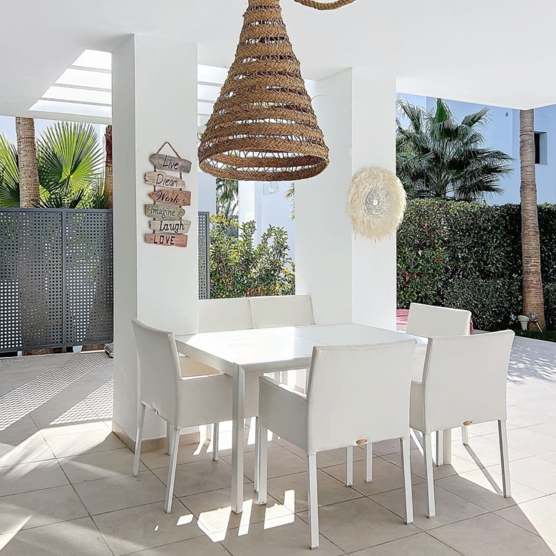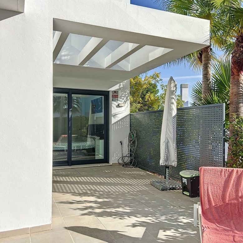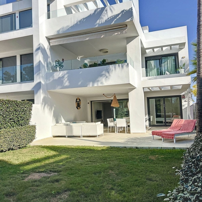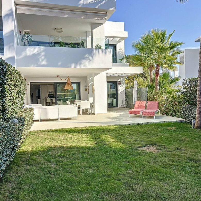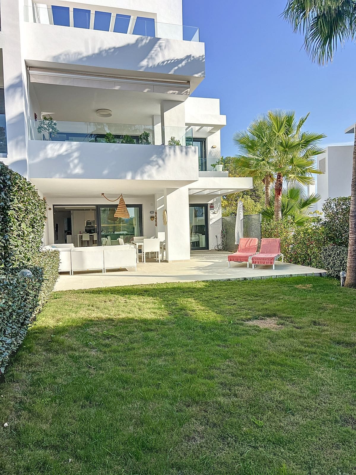 Superb very spacious ground floor apartment in excellent condition in the modern , contemporary new urbanization Terazas de Atalaya ! This apartment is very light and bright thanks to the big living room with large sliding windows overlooking a huge terrace and a big garden, facing west , south-west !