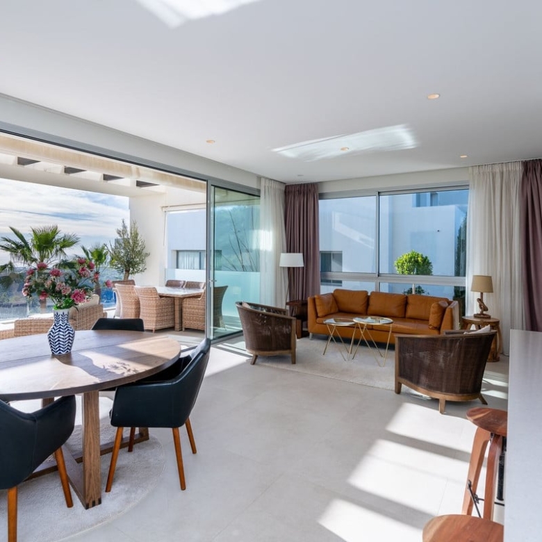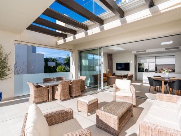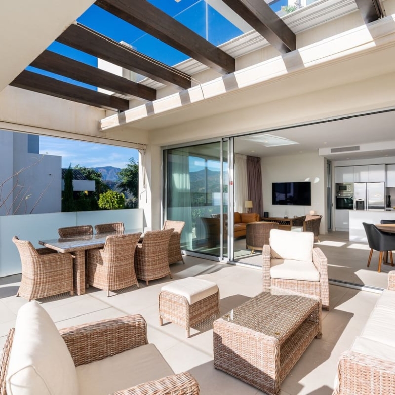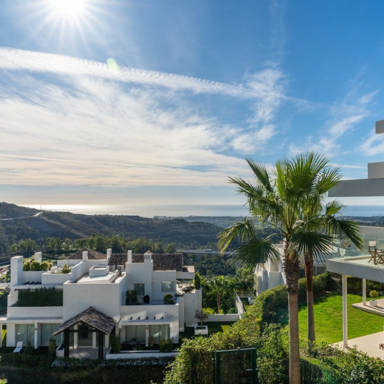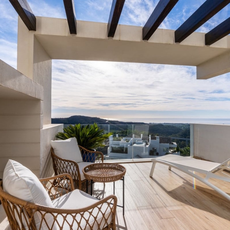 Nestled in the prestigious gated community of Marbella Club Hills, this 160 m2 south-facing residence offers three generous terraces spanning 74 m2, complemented by an additional 85 m2 of west-facing private garden, providing an unparalleled outdoor living experience on the vibrant Costa del Sol.