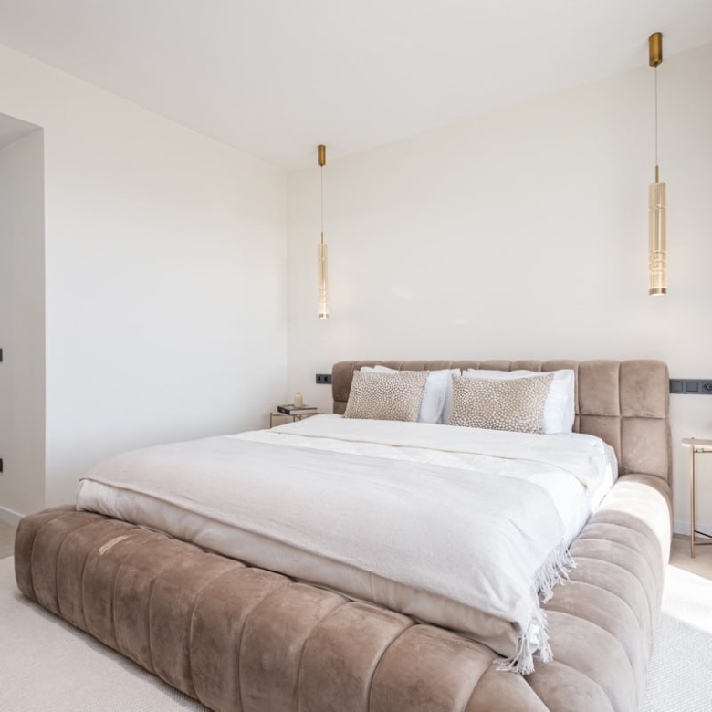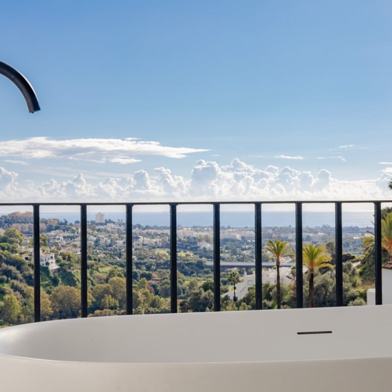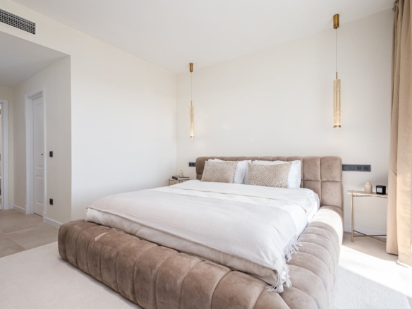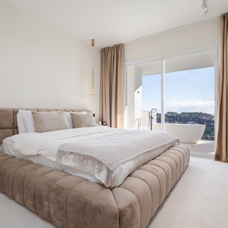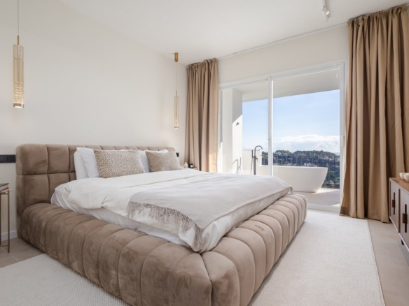 Meticulously renovated to the highest Scandinavian standards, this home features three generously sized bedrooms and two beautifully designed bathrooms. The interiors are flooded with natural light and decorated in calming, neutral tones that create an inviting atmosphere. The piece de resistance is the spacious terrace, which comes complete with a cozy outdoor bathtub. From here, you can soak in panoramic views of the mountains, the shimmering sea, and the lush fairways of the surrounding golf course – the perfect setting for relaxation or entertaining.