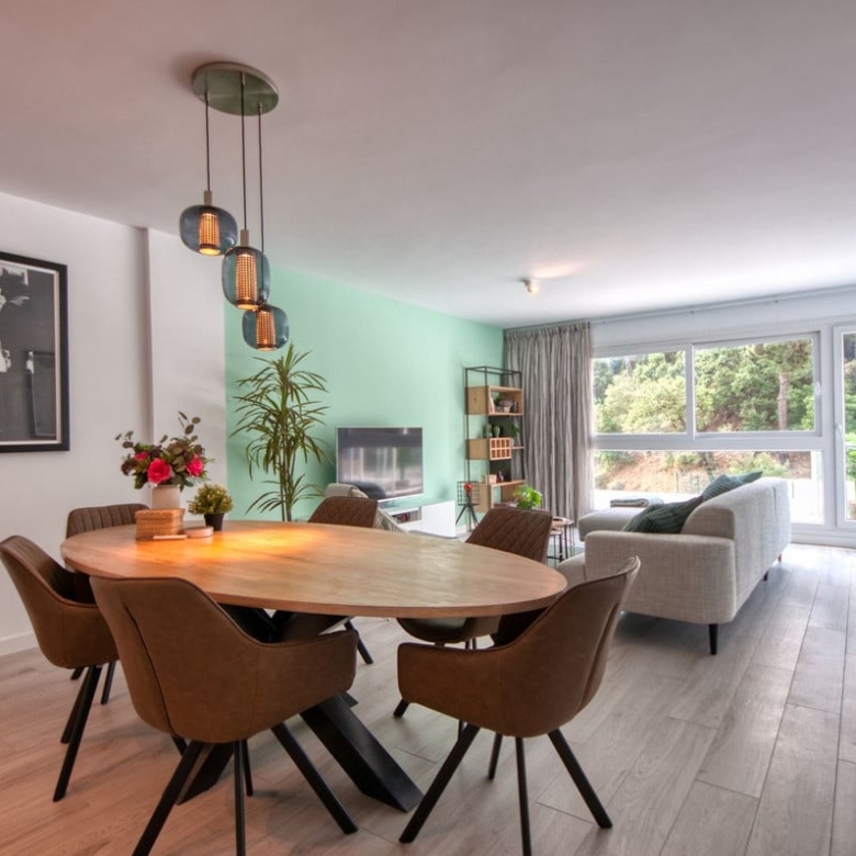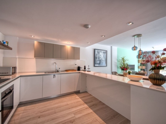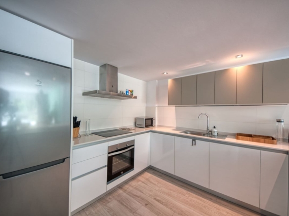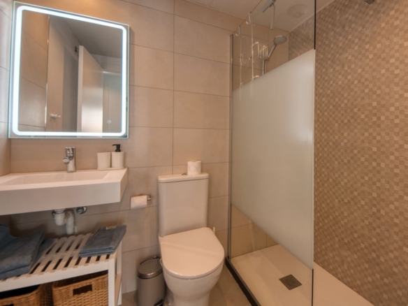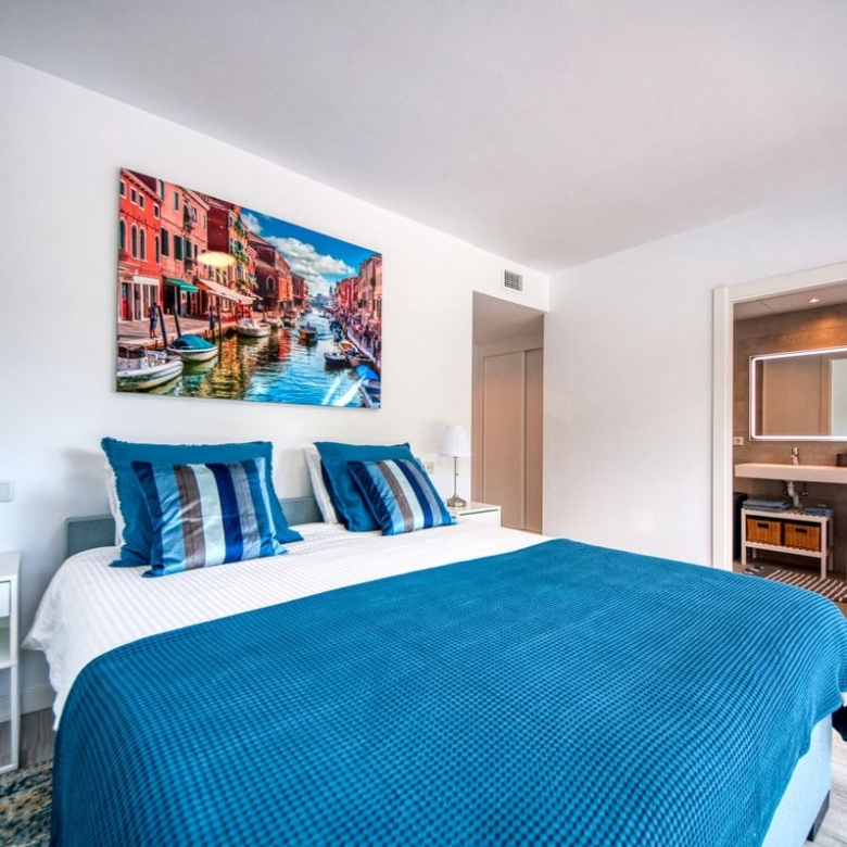 A sliding door separates the living area from the sleeping quarters, which include three double bedrooms with built-in wardrobes and electric blinds. The master bedroom has an en-suite bathroom and terrace access, while the other two bedrooms share a bathroom.