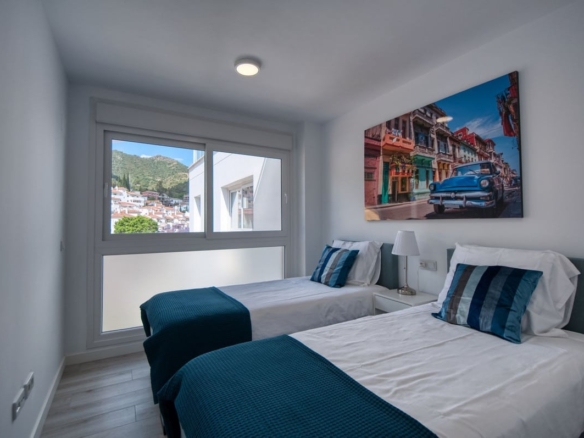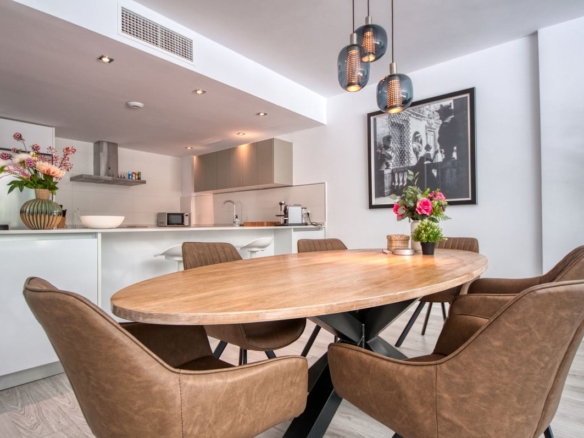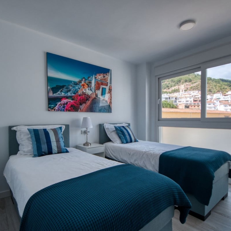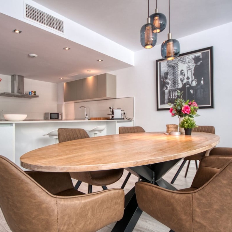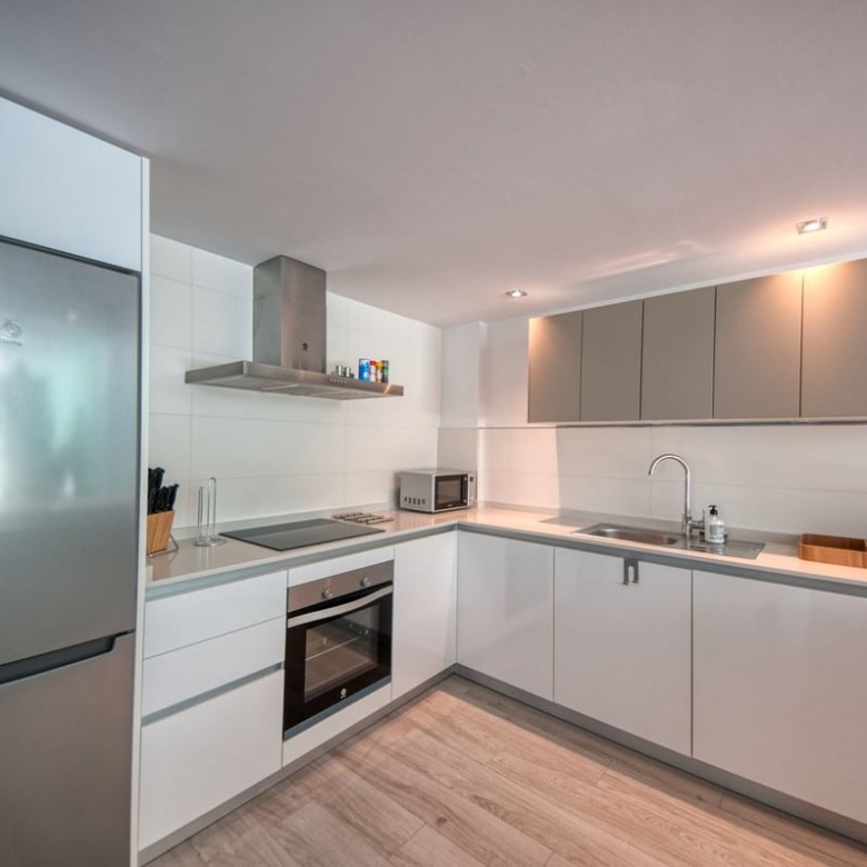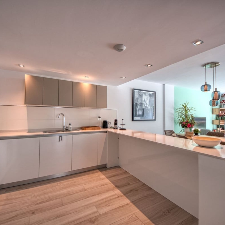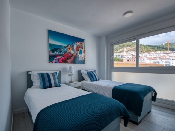 Spacious penthouse in Benahavis with the following layout. The main floor features an open-plan living area leading to a terrace with views over the pool and village. The modern kitchen is fully equipped with top-of-the-line appliances and additional storage.