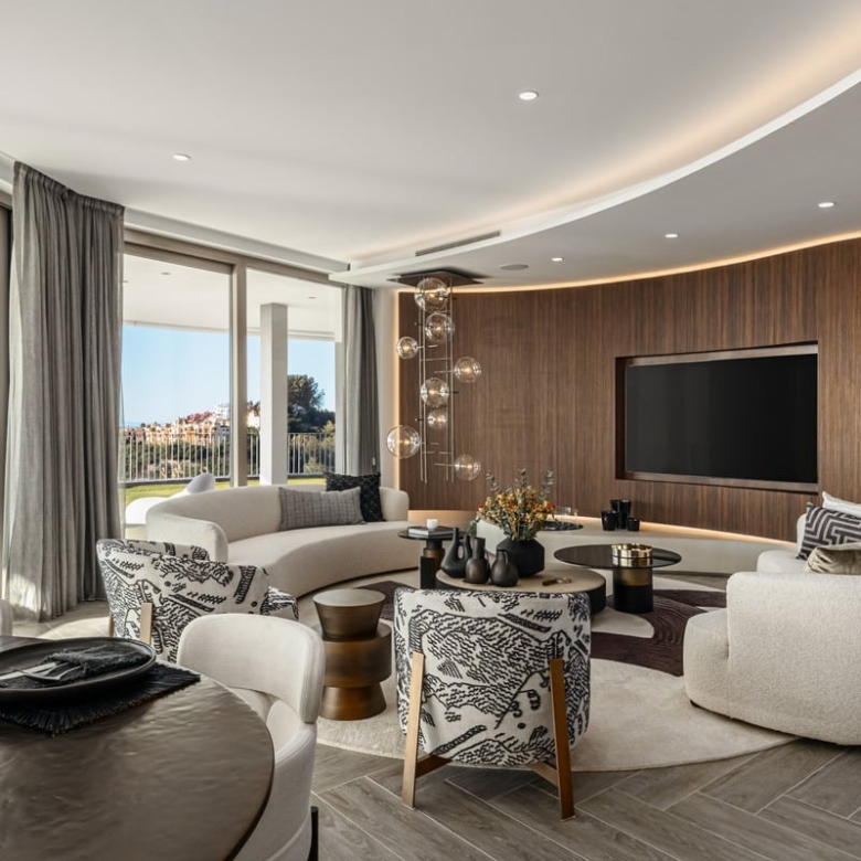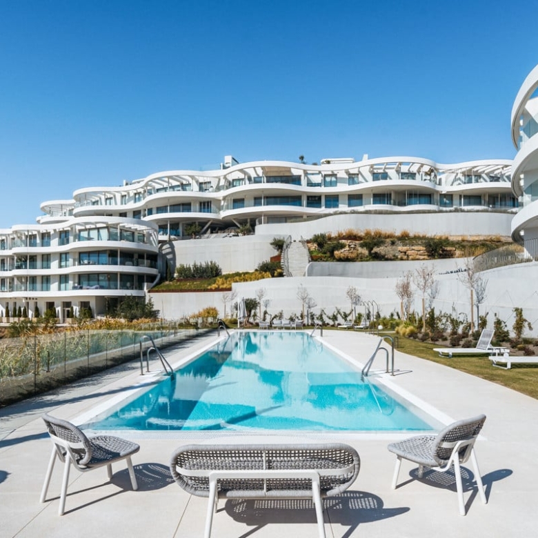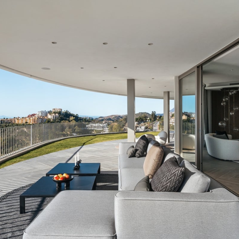Discover this modern 3-bedroom ground floor apartment in a new eco-friendly development in Benahavis, offering panoramic sea views. Situated within a gated resort-style community surrounded by lush landscaped gardens, this apartment embodies contemporary design and organic architecture principles, blending seamlessly with its natural surroundings. inspired by Frank Lloyd Wright’s philosophy, the property integrates innovative design with state-of-the-art interiors, setting new standards for luxurious living. Enjoy premium amenities such as 24-hour security, a Kids’ area, concierge services, tennis/paddle courts, a spa, and indoor/outdoor pools.