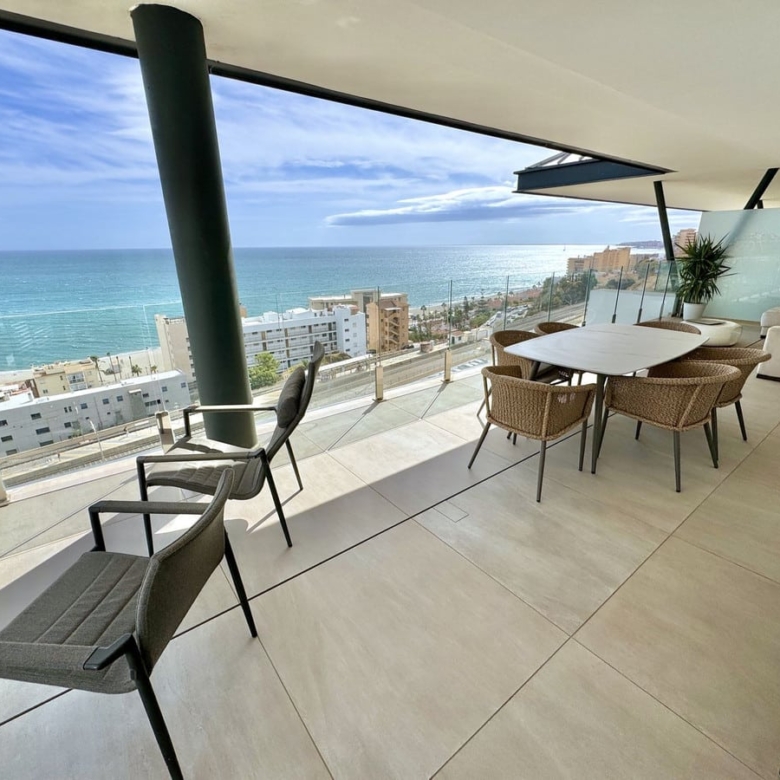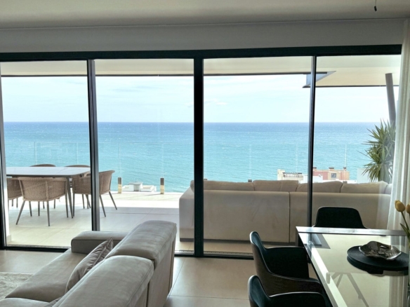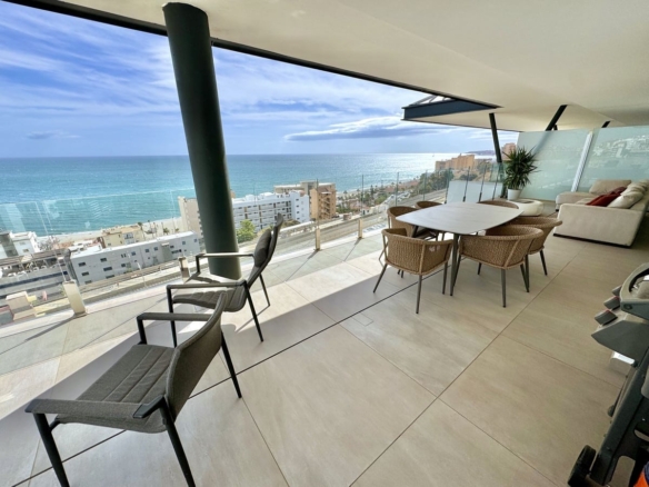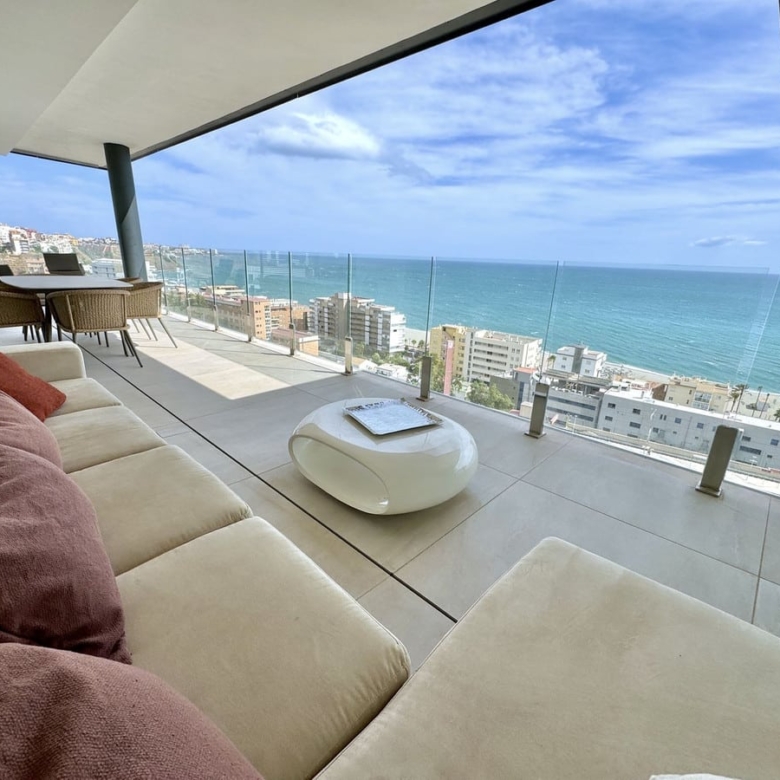 MASSiVELY REDUCED – Stunning 3 bed corner duplex Penthouse only 100m to beach, shops & restaurants, with breathtaking 180º Mediterranean sea views. Located in exclusive El Higueron Spa / Sports community with Beach Club.