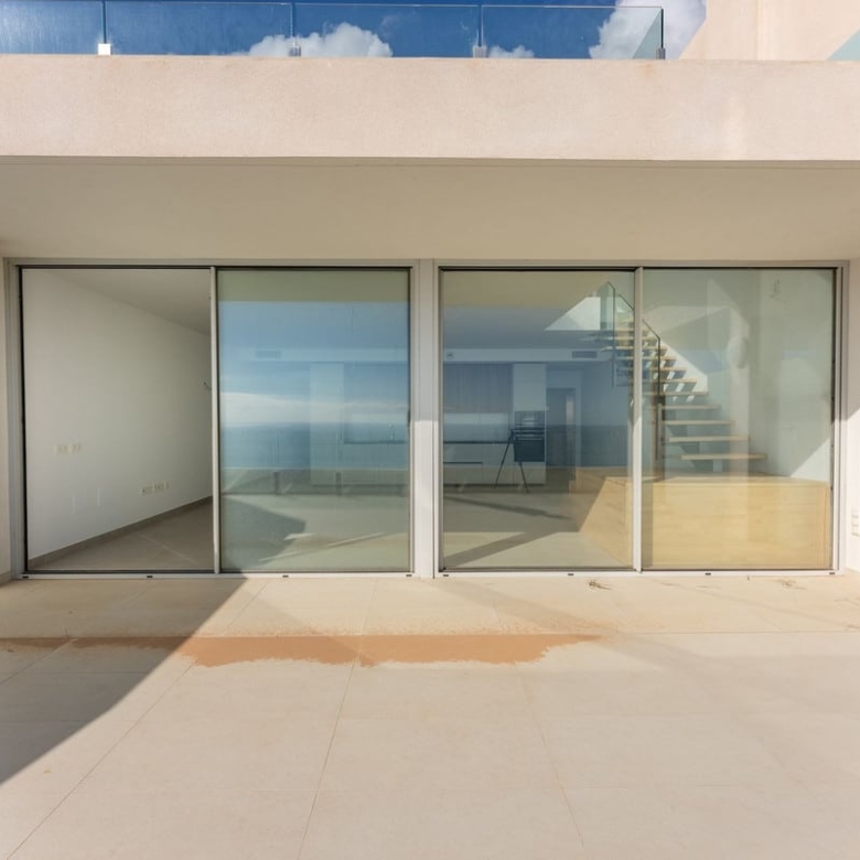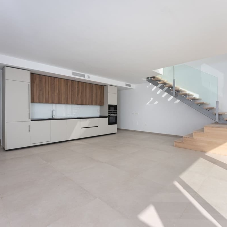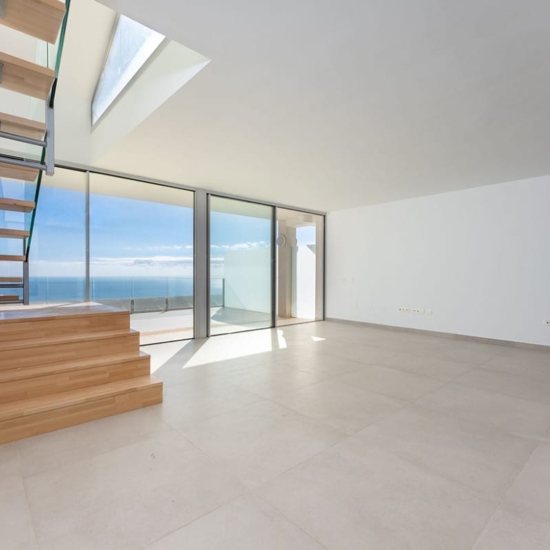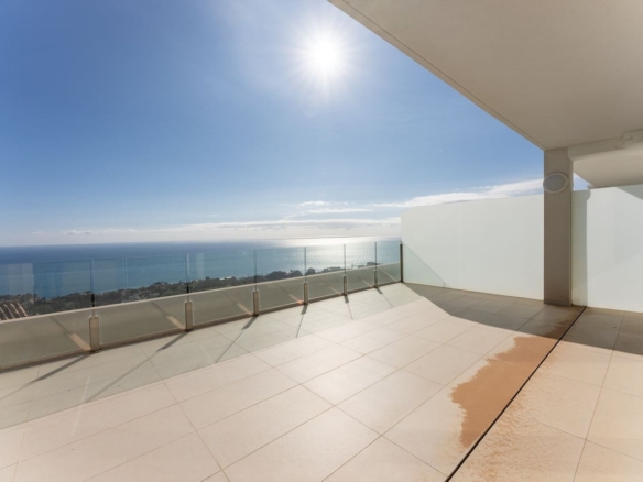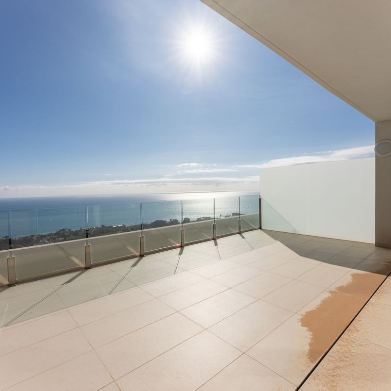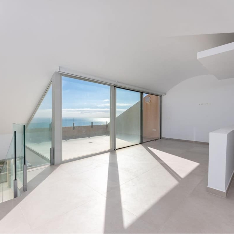Brand new south facing penthouse duplex, located in an exclusive urbanization. The property consists of hall, 2 bedrooms with built-in wardrobes and electric blinds, guest bathroom, open plan kitchen fully furnished and equipped with electricial appliances from Siemens. Spacious living-dining room that leads out to a terrace of 34m2 with panoramic sea views, the Fuengirola Bay and of the Buddist Temple. On the top floor is located the main bedroom with walk-in closet and ensuite bathroom. The bedroom leads out to a terrace of 16m2 with panoramic sea views. Air conditioning hot and cold with Airzone, video intercom, domotic system, pre-installation alarm system. includes two parking spaces and one storage room.