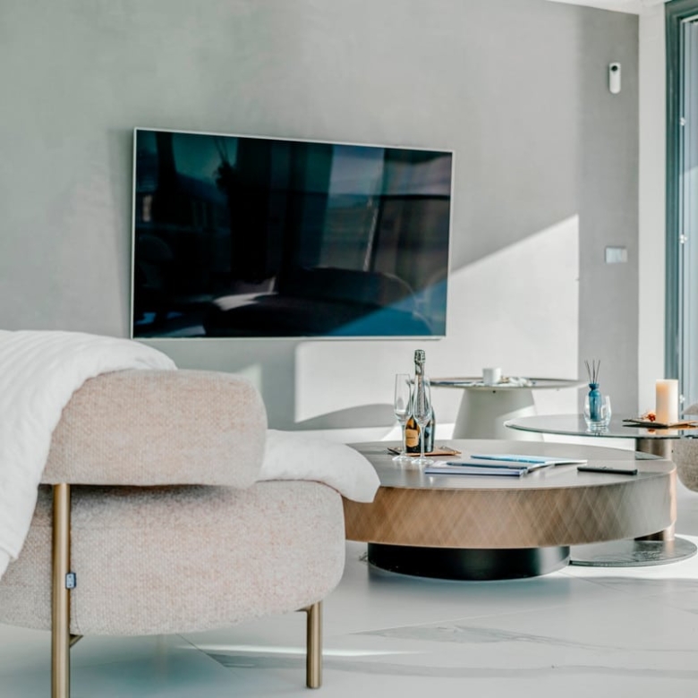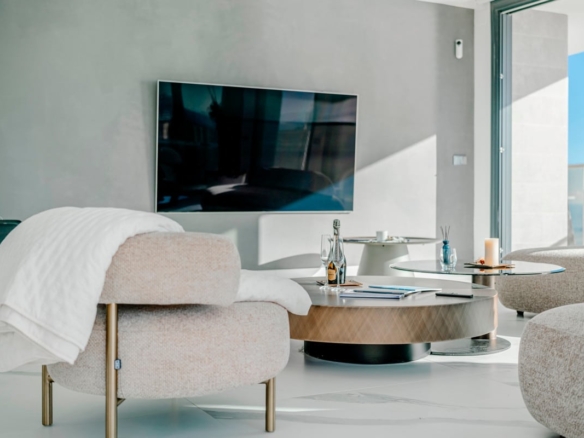 The spacious living area is bathed in natural light, featuring an open-concept kitchen equipped with high-end Samsung smart appliances and exclusive Porcelanosa finishes. With its seamless design and premium materials, this space is perfect for both everyday living and entertaining.