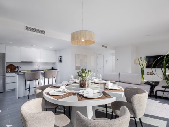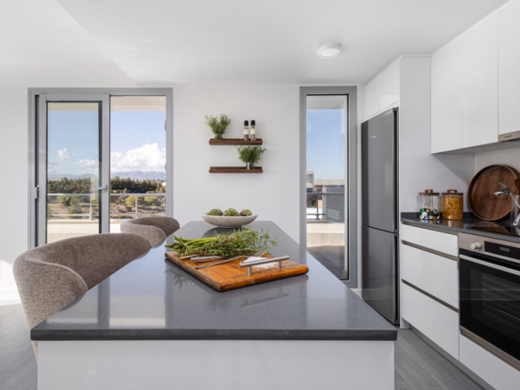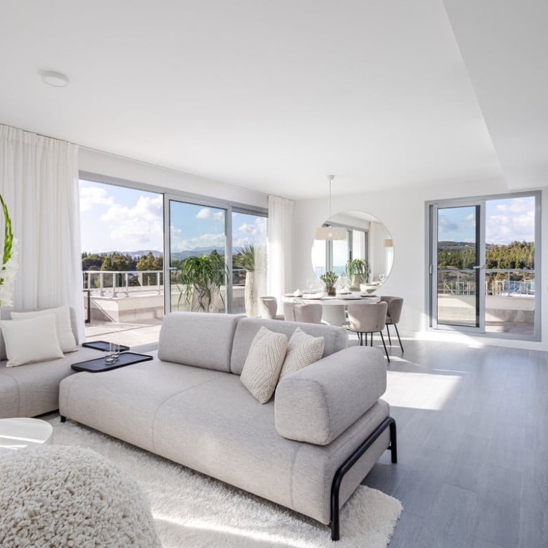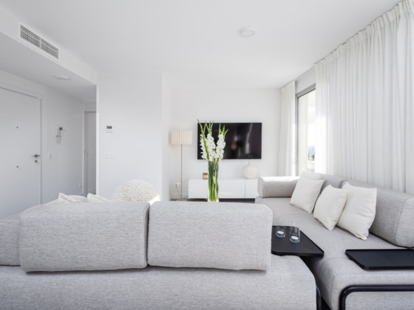 The penthouse features a spacious, open-plan design with high-end finishes and abundant natural light, maximizing the breathtaking sea views and creating an inviting atmosphere throughout.