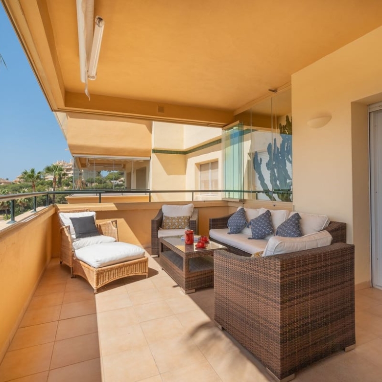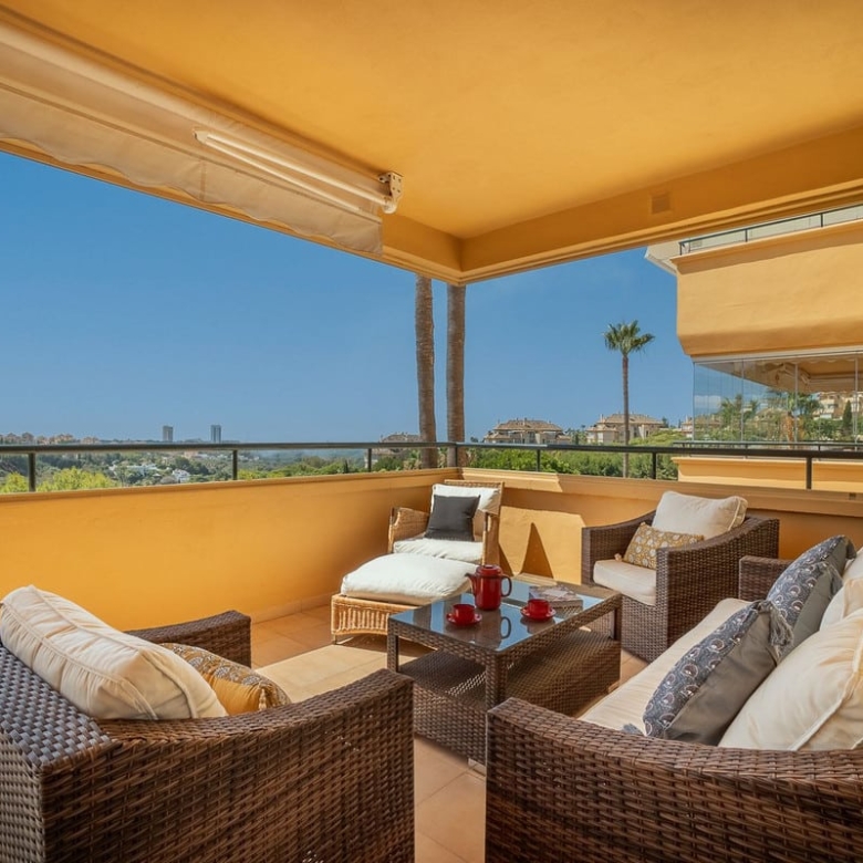 The over 30m2 terrace with crystal curtains has spectacular views over the Elviria valley and the sea.