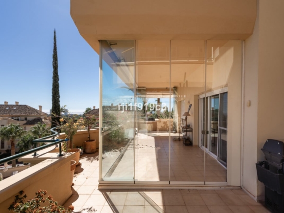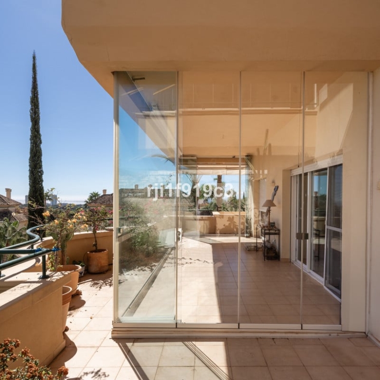 Discover your dream home in the heart of Elviria, Marbella! This stunning raised ground floor apartment boasts 150 m2 of beautifully designed living space, complemented by a generous 55 m2 terrace, which has been partially enclosed with glass curtains, making it possible to enjoy it all year round.