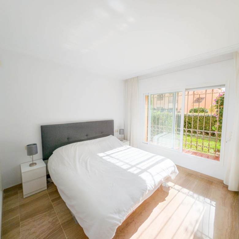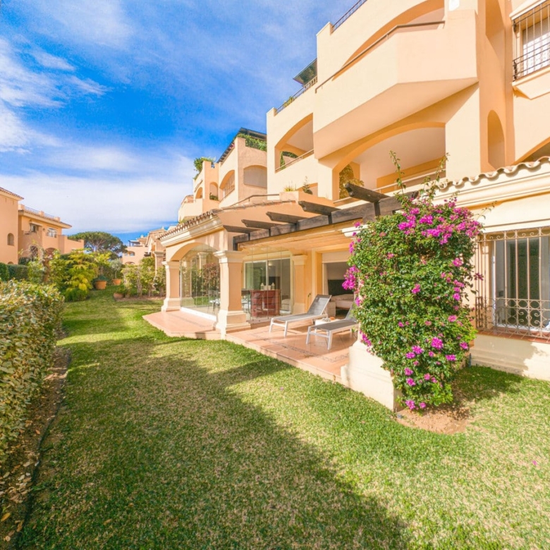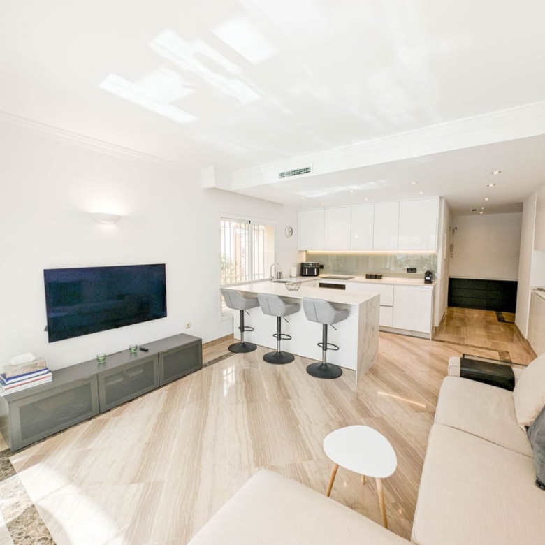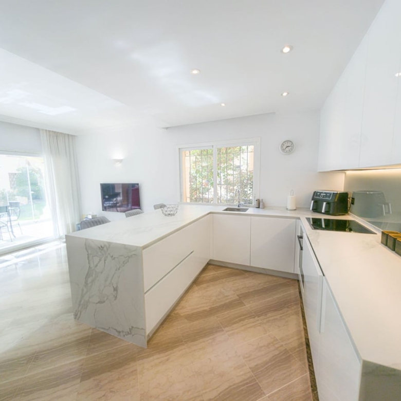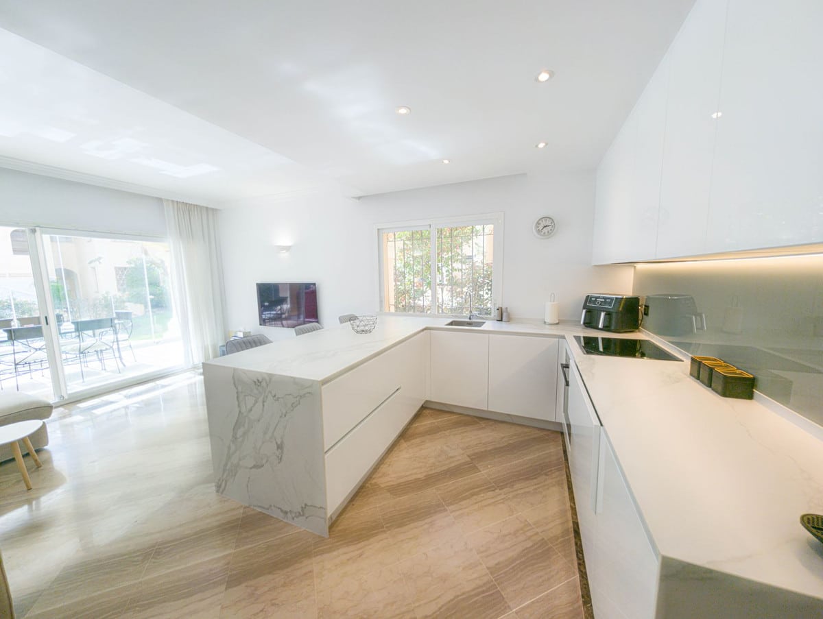 Discover luxury living in this absolutely stunning south-facing garden apartment, nestled in a highly sought-after development. This property features a seamless transition to a spacious 3-bedroom layout, complemented by a brand-new open-plan kitchen equipped with top-quality Siemens appliances. The dining area is enhanced with elegant glass curtains, creating a beautiful and versatile space for year-round enjoyment. Residents can indulge in the complex’s extensive amenities, including four large swimming pools, two children’s pools, and exquisitely maintained gardens that underscore the development’s superior build quality. Perfectly positioned, the apartment is just a short walk from Elviria’s renowned selection of fine dining, vibrant bars, and pristine beaches. An underground parking space is included, adding convenience and value to this exquisite home.