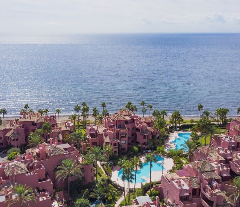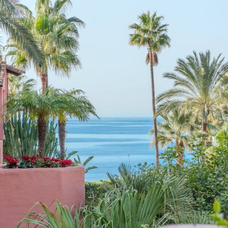 impressive three bedroom south facing duplex penthouse in the prestigious and gated beachfront community Menara Beach, Estepona. This sought-after complex has well-kept tropical gardens, outdoor communal swimming pool, indoor heated swimming pool and gymnasium, as well as being just ten minutes’ drive to Puerto Banus and a short drive to shops, restaurants and all amenities. The property has an open plan living and dining area with patio doors leading to two private terraces with beautiful sea views; fully fitted kitchen with separate laundry area; guest suite with access to the terrace; guest bedroom; and a guest bathroom. The upper-level leads to the impressive master suite with vaulted ceilings and a private terrace; on this level there is an additional large terrace with BBQ area and stunning views of the community and sea. Other features include fitted wardrobes throughout, marble floors, hot and cold air conditioning, underfloor heating in the bathrooms, private parking and store room.