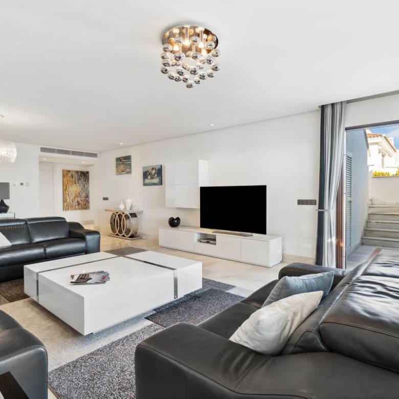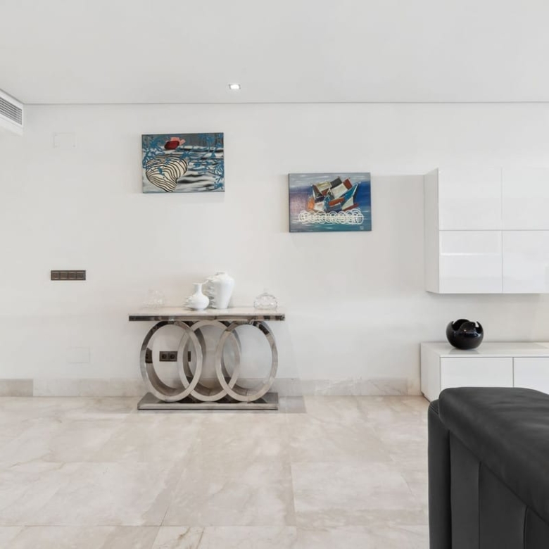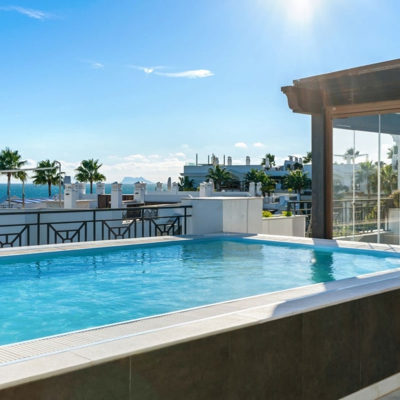 The apartment has a spacious separate entrance which leads comfortably into a spacious living room, separate kitchen and guest toilet. From the lounge there is access to a large south facing terrace, ideal for sunbathing, with spectacular sea views and natural light throughout the day. The spacious rooms will make you feel on top of the world. There is also a private heated swimming pool for Mediterranean style swimming. The terrace leads to the first floor, where there is a spacious 186m2 solarium with uninterrupted views of the mountains, Gibraltar and the port of Estepona, all bathed in the blue of the Mediterranean.