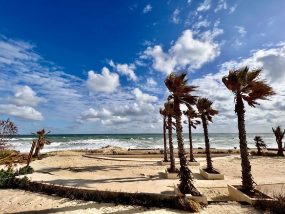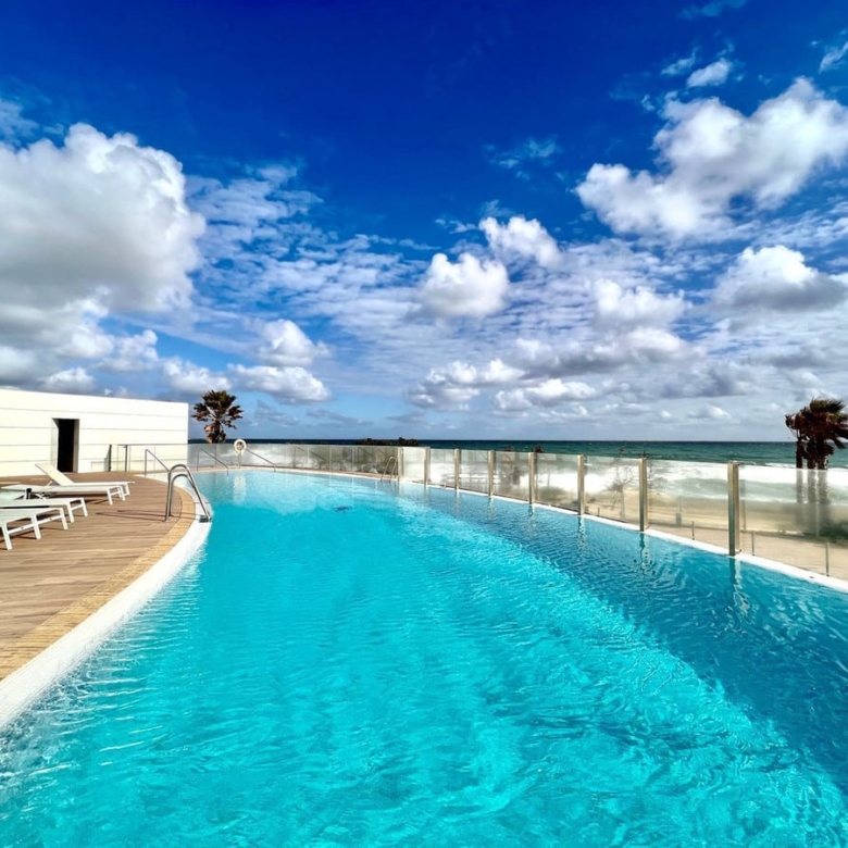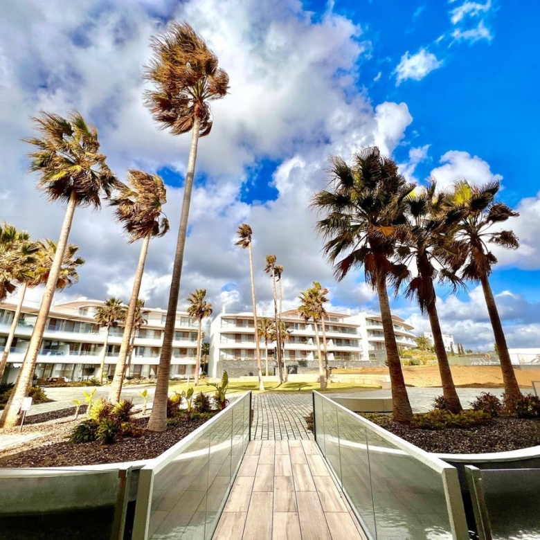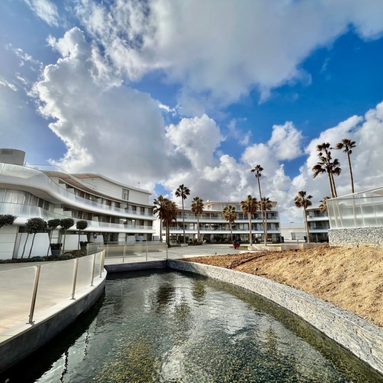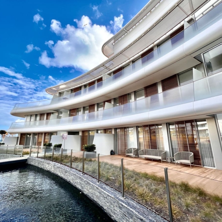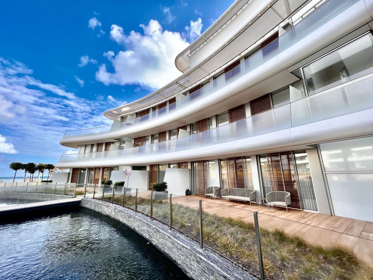 The residential complex stands as a masterpiece of contemporary Mediterranean architecture, with undulating facades echoing the nearby waves and sands of the beach, which is directly accessible.