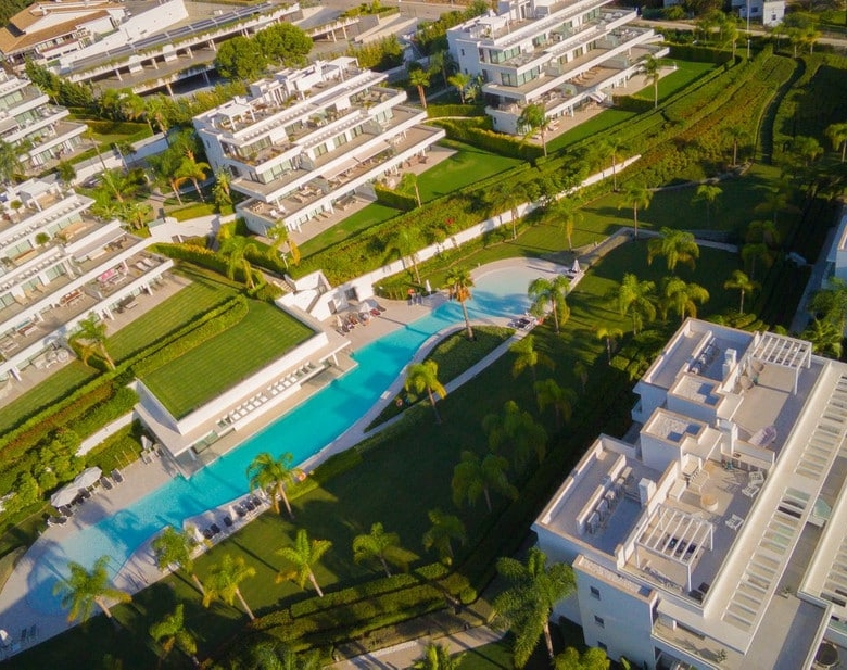 The complex offers expansive landscaped gardens and two spectacular swimming pools: