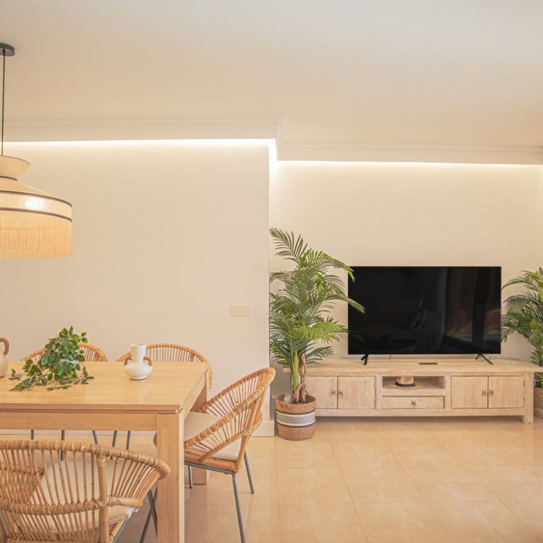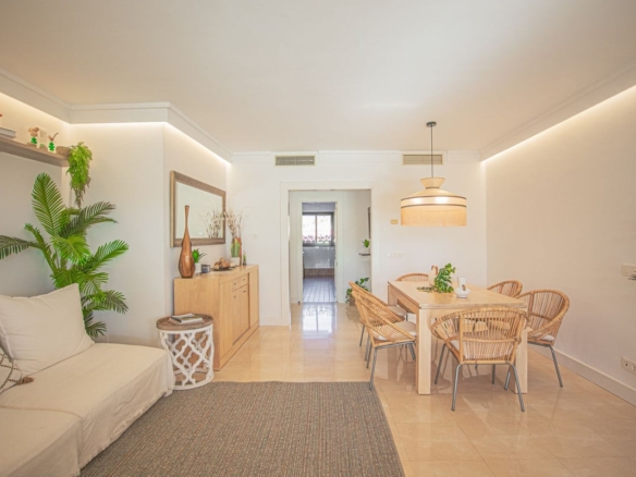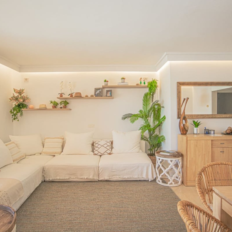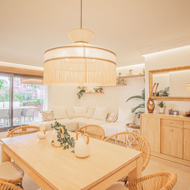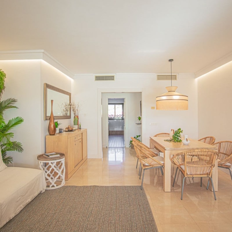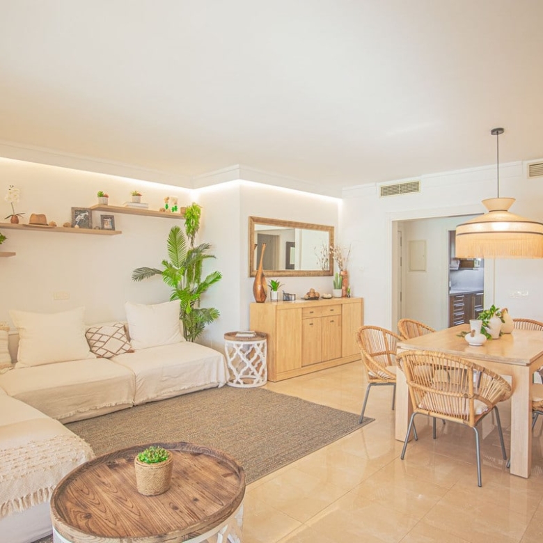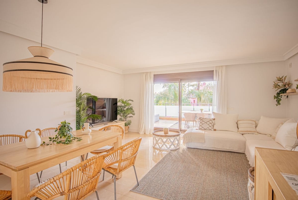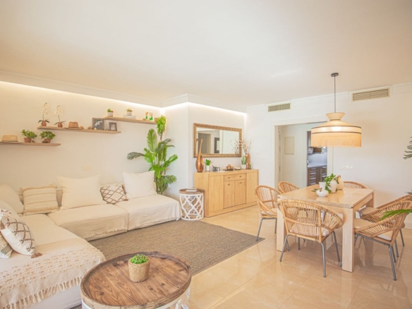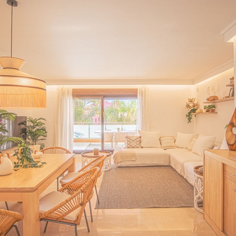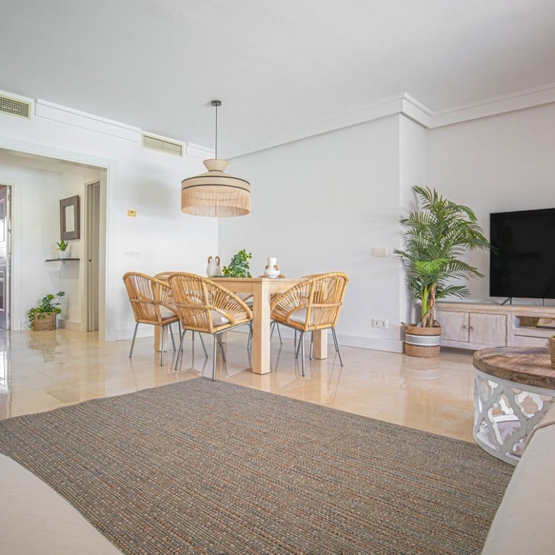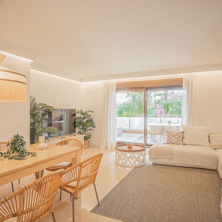 Renovated apartments with 3 bedrooms, living room, kitchen, two terraces, with all amenities in Las Salinas. The apartments are located 200 meters from the beach, 8 km from Estepona, 18 km from Marbella and 34 km from Ronda. it offers 2 shared outdoor pools, 1 indoor pool, sauna, gym and free Wi-Fi. The master bedroom has a private bathroom, King-size bed, large TV, large closet and private access to the terrace. The second bedroom has two separate beds , bedside table, closet, large TV and access to a small terrace. The third bedroom has two separate beds, bedside table, closet, large TV and access to a small terrace. The second bathroom with shower and toilet has a separate entrance from the shared hallway. The kitchen is equipped with a built-in dishwasher, refrigerator, hob, oven, microwave, extractor hood, kettle, toaster and coffee maker. The living room has a large flat screen TV, a large dining table for 6 people, a large corner sofa and access to a large sun terrace. There is also a laundry room with washer and dryer, ironing board and iron.The apartment has dedicated parking space in the undergounf parking and a storage room. Apartment will be sold fully furnished.