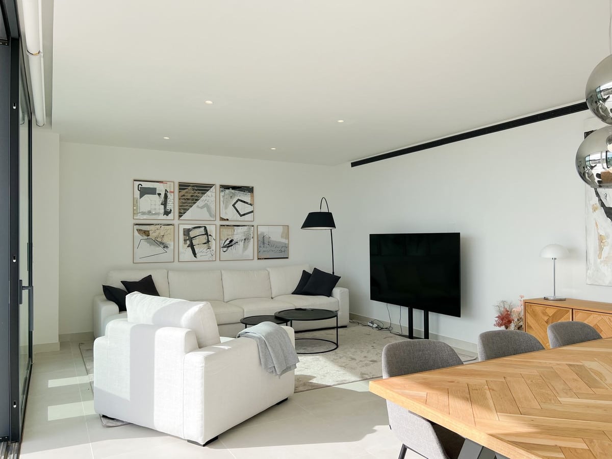 The kitchen is fully fitted with modern, high-quality appliances, and other modern features as well as a stunning island – creating a fantastic entertaining space. The dining/living room speaks for itself, it is just the perfect space for entertaining guests, lounging, or simply enjoying your morning coffee as you look out at the Mediterranean Sea.