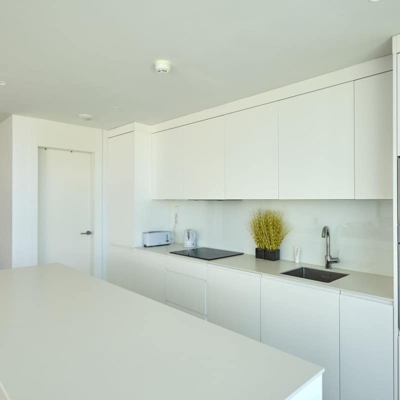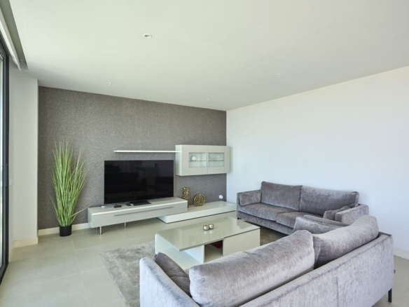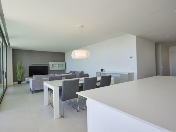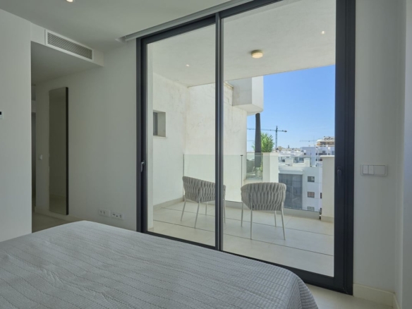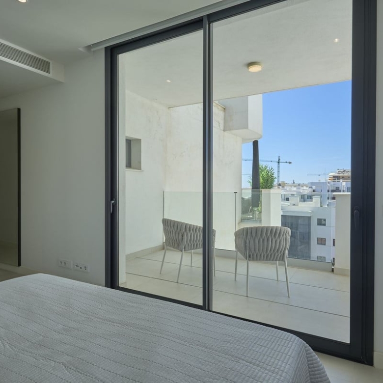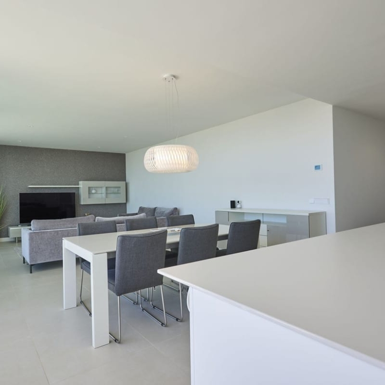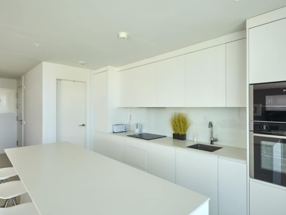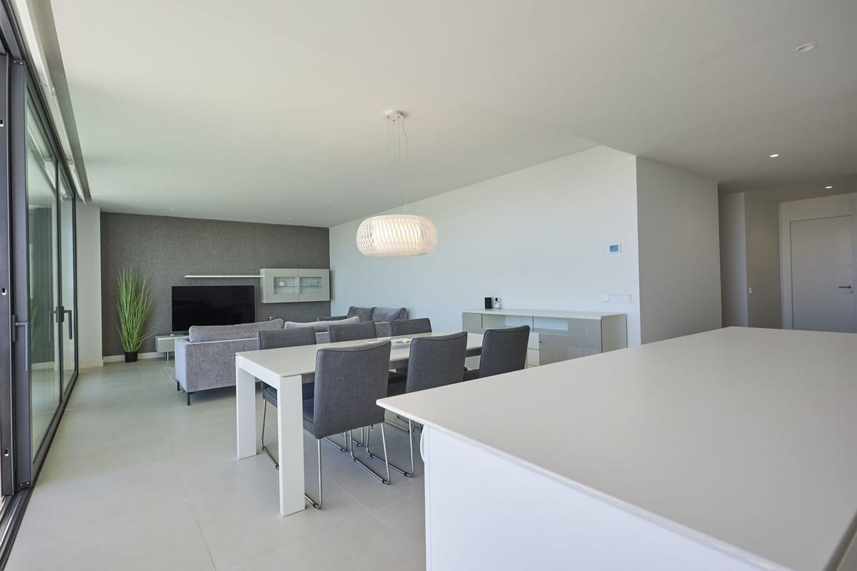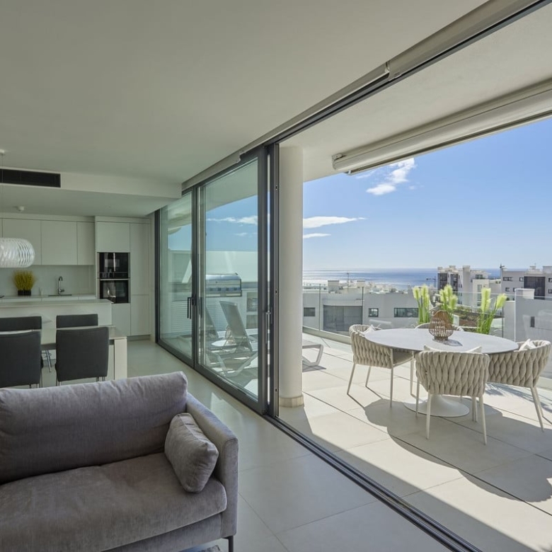The bright and open living space, with floor-to-ceiling windows, connects seamlessly to a state-of-the-art kitchen, fully equipped with premium appliances. The master bedroom features an ensuite bathroom, a walk-in wardrobe, and access to a private terrace with stunning sea views, while the other two bedrooms share a stylish second bathroom and from the hallway there is an extra guest toilet.