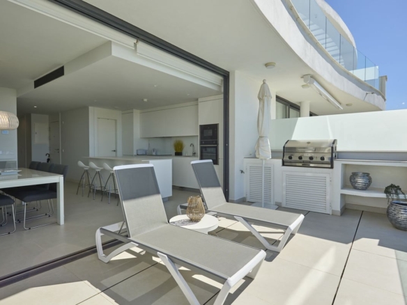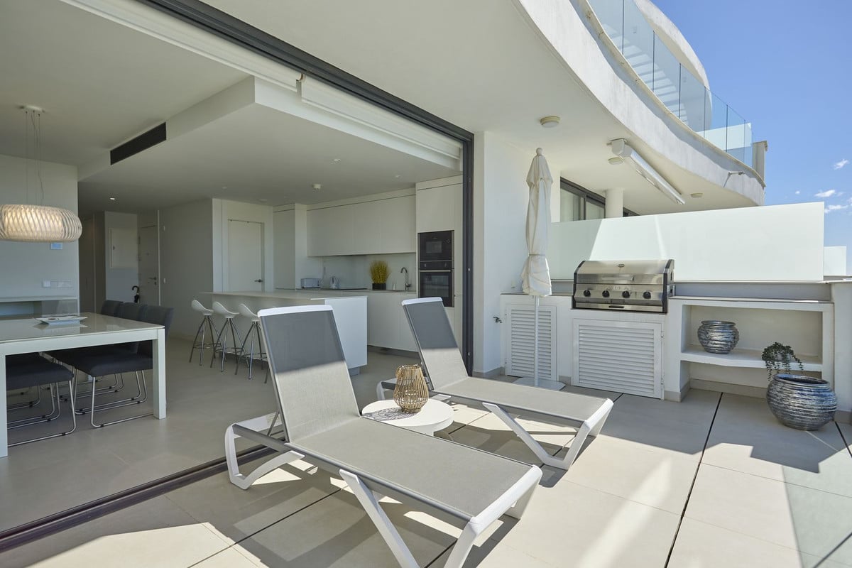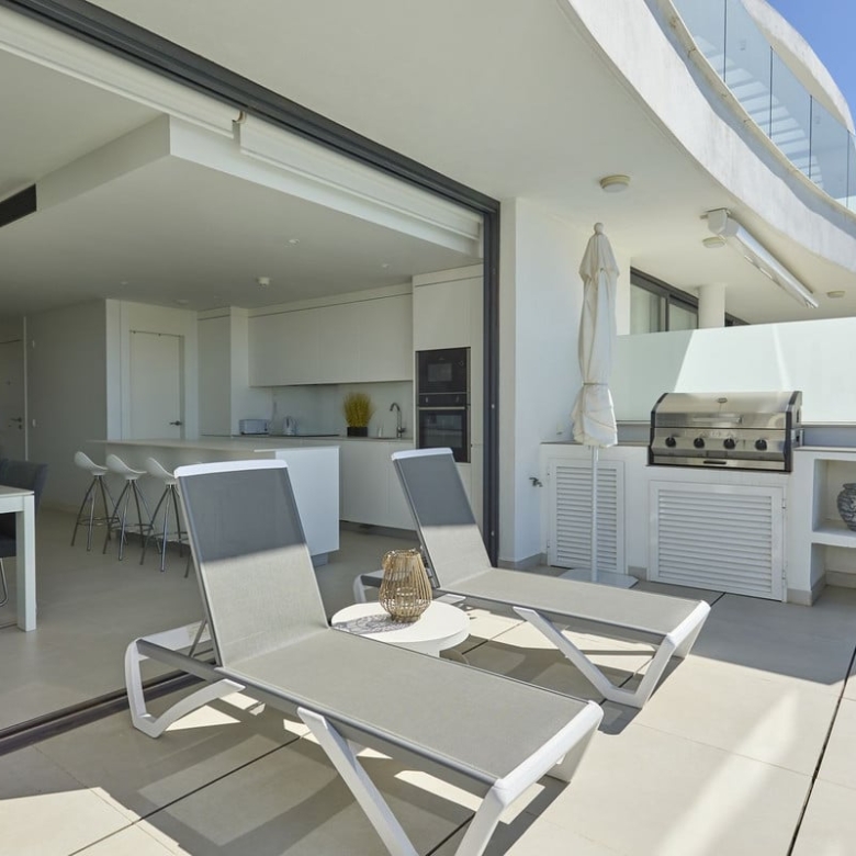 Offering 113.88 m2 of refined living space, this modern residence, completed in 2021, boasts 3 spacious bedrooms and 2.5 bathrooms, perfectly blending comfort and elegance. One of the apartment’s highlights is its two expansive terraces: 38.65 m2 off the living room offering sea views and another 9.85 m2 off the master bedroom with views of the surrounding landscape. These terraces are ideal for soaking up the sun during the day or relaxing at sunset, with the added luxury of an outdoor kitchen and barbecue area.