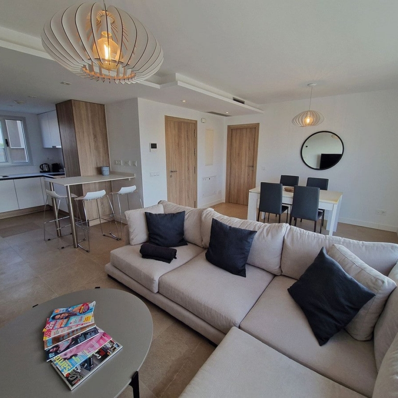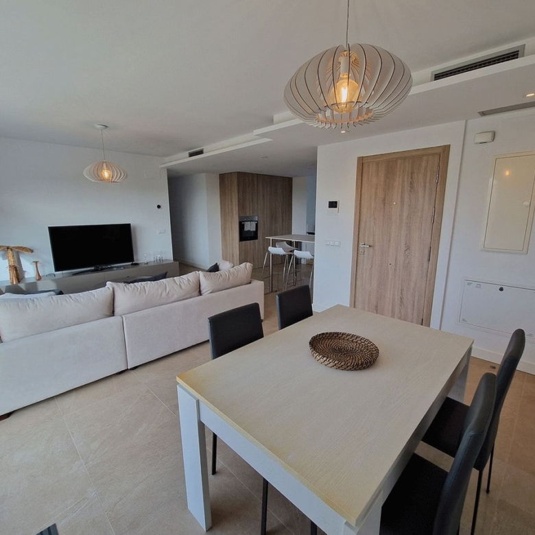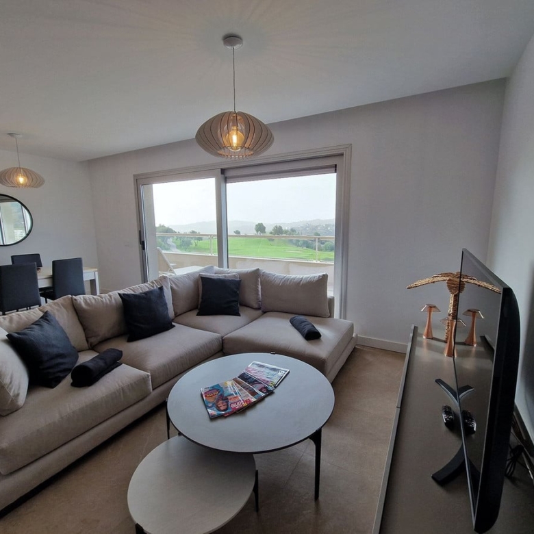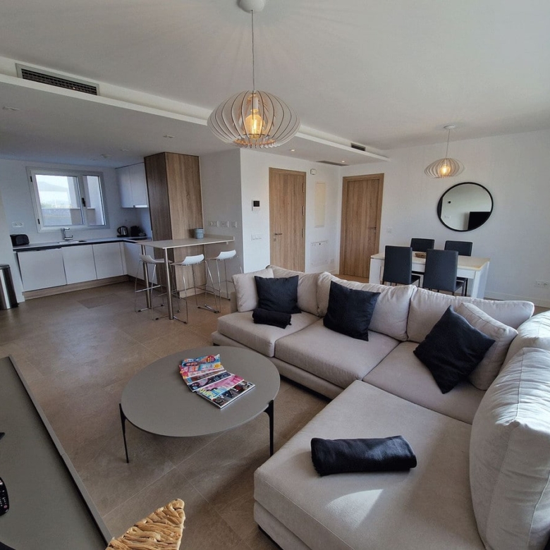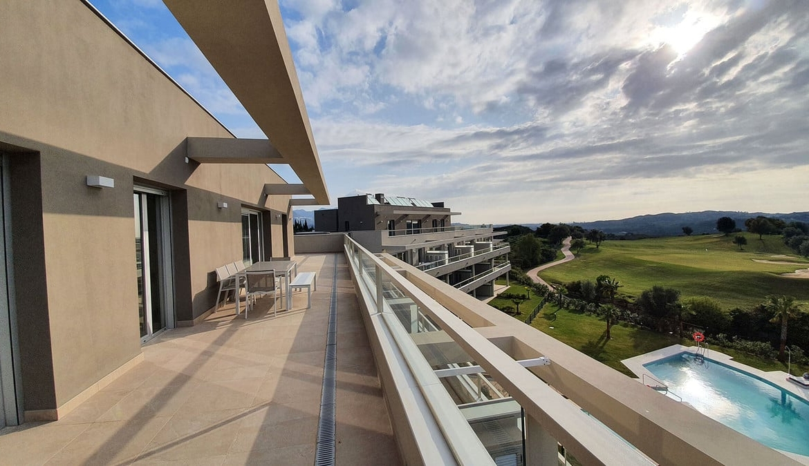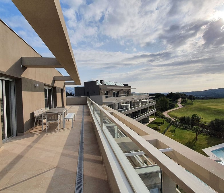 ONLY ONE PENTHOUSE AT THAT FLOOR! This beautiful brand new three-bedroom penthouse stands out for its contemporary style and quality design, it is built with the latest materials and amenities: ceramic floor with large tiles (60×60 cm) from the SALONi brand, in the spacious living room is the kitchen Open built-in with appliances, the two bathrooms with sanitary quality, LED lighting, hot and cold air conditioning and solar panels with the best thermal and acoustic insulation. it is a bright penthouse with lots of natural light and large terrace to enjoy the sun and the beautiful view of the golf courses throughout the day and the sea.