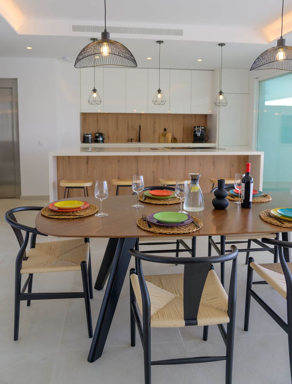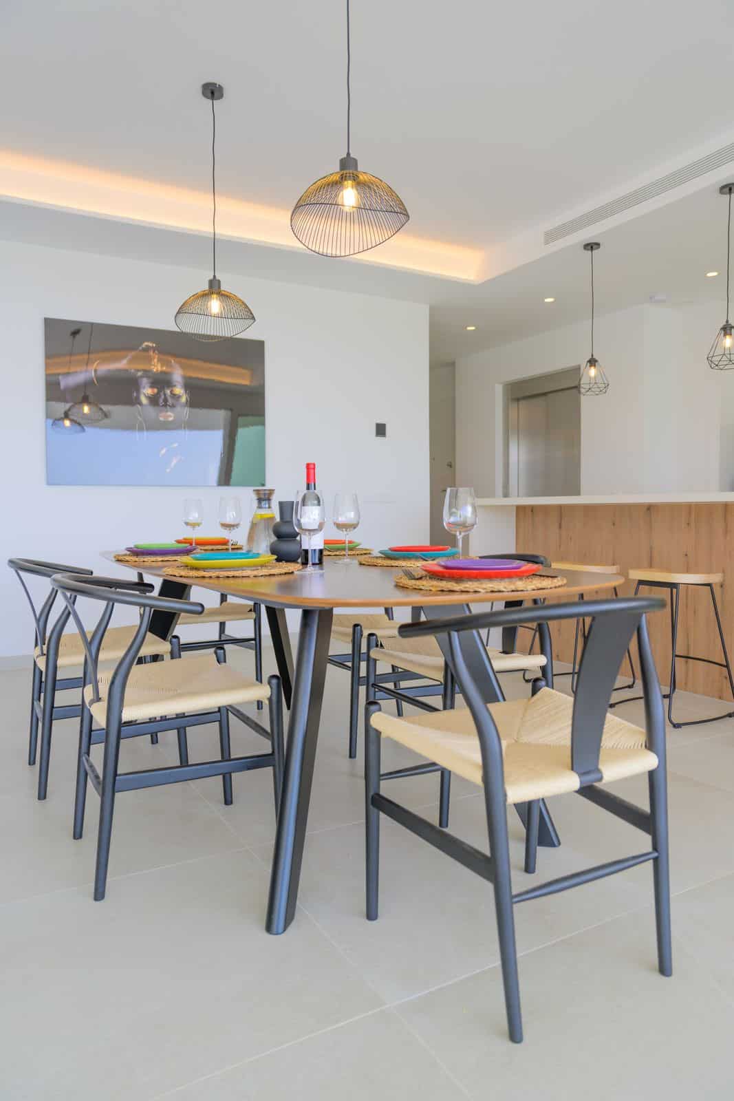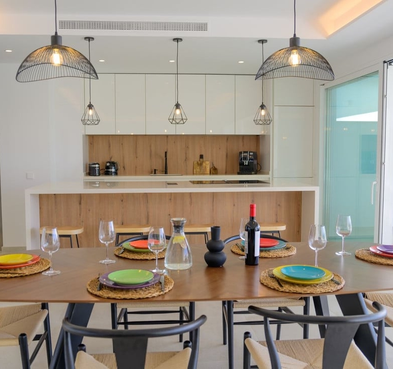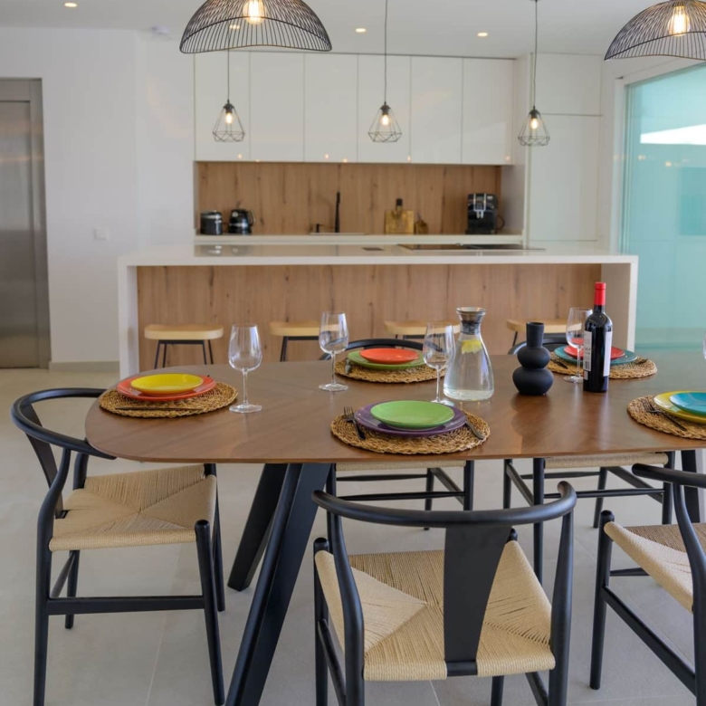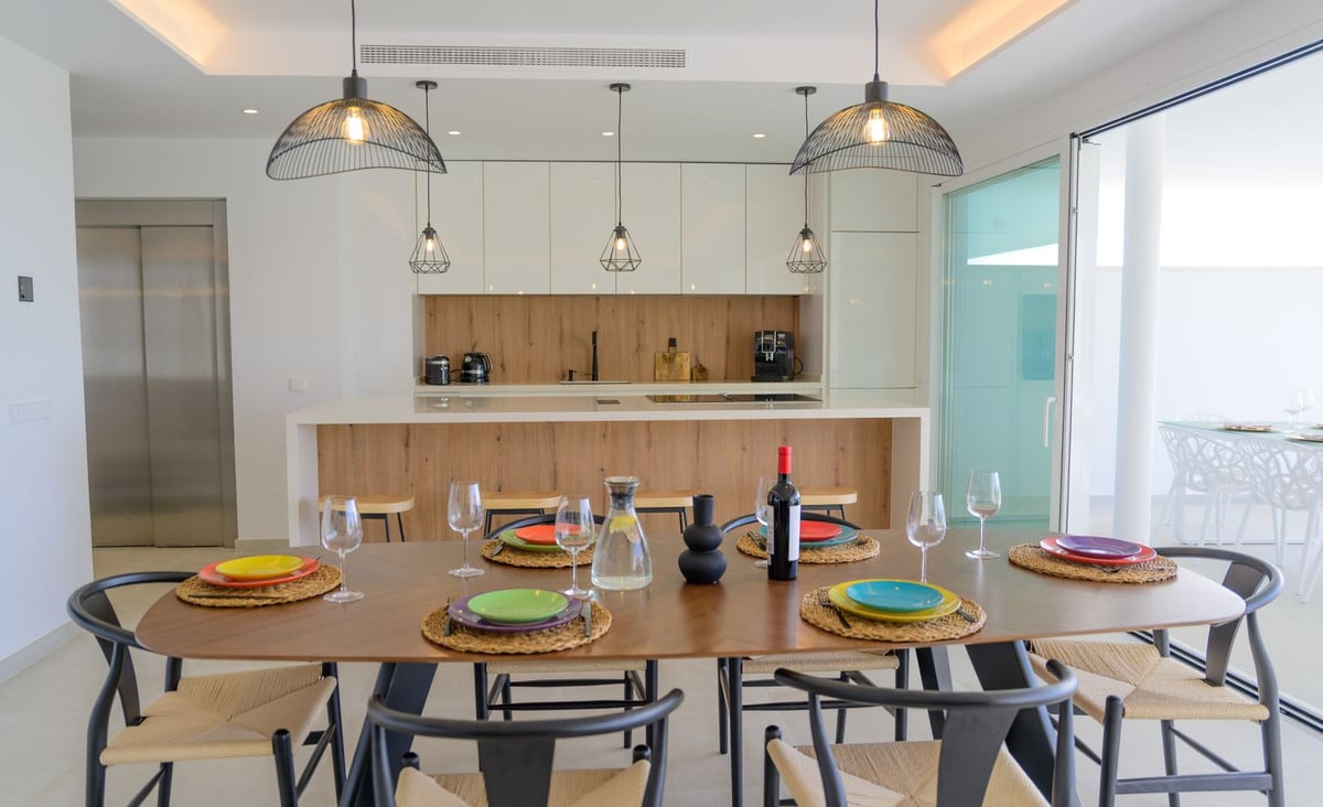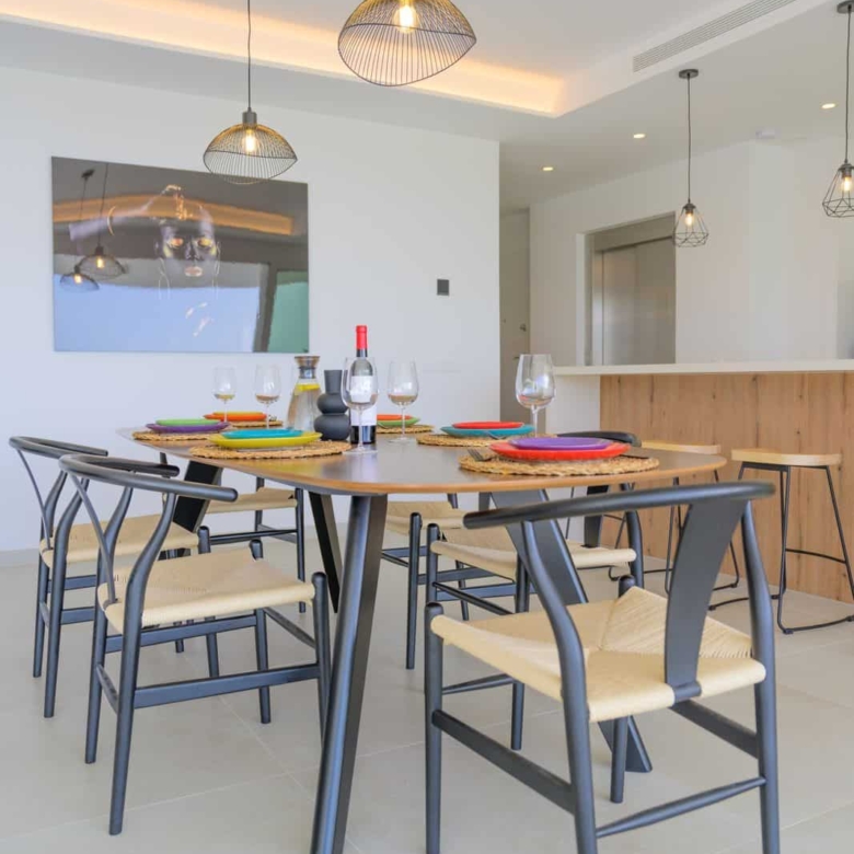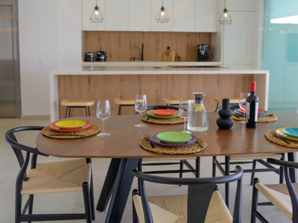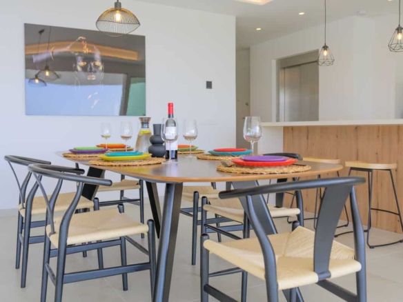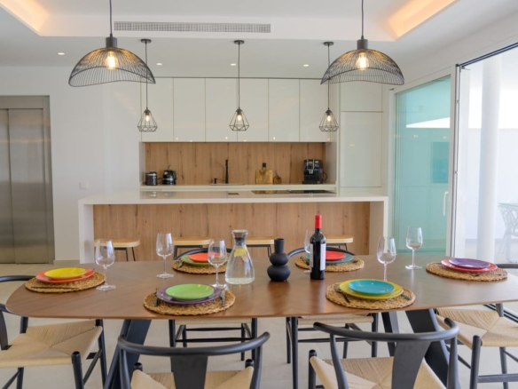 The modern kitchen features a large island with drawers , connecting it with the bright living and dining areas. Equipped with top-of-the-line appliances, including a quiet dishwasher, self-cleaning oven, fridge, freezer, and wine cooler. The kitchen offers everything a discerning chef needs. The living room terrace offers a tranquil space to relax or enjoy a sunset dinner, while the glass railing ensures unobstructed panoramic views of the sea.