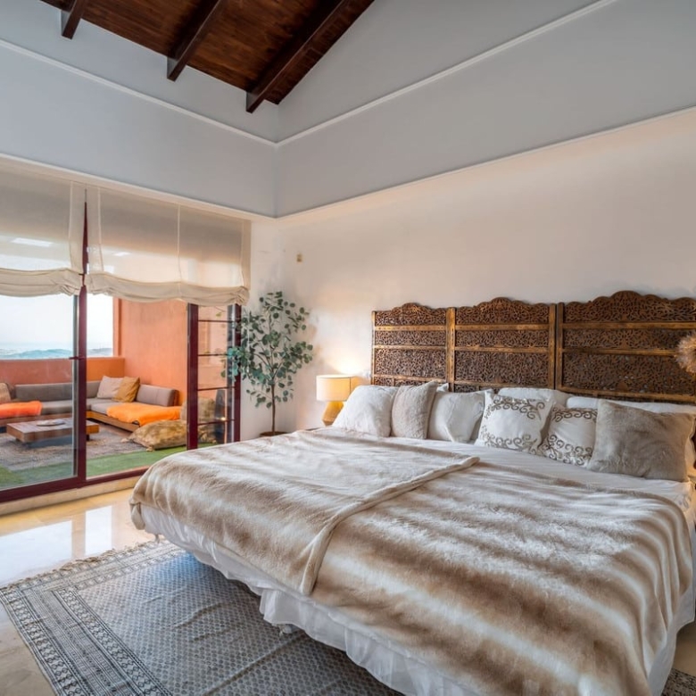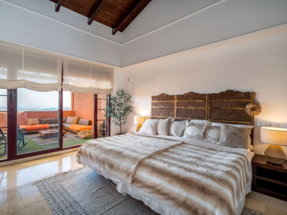 Ascending the internal staircase, you reach the exclusively dedicated master suite, a standout feature of this penthouse. Encompassing over 30m2, this elegant retreat boasts a vaulted ceiling with exposed wooden beams, a fireplace, and its own private terrace, offering yet another vantage point for the spectacular views. The suite also benefits from a spacious walk-in wardrobe and dressing area, as well as a luxurious ensuite bathroom, ensuring complete privacy and comfort.