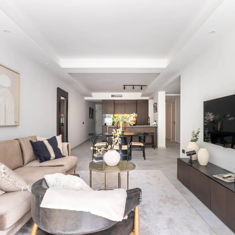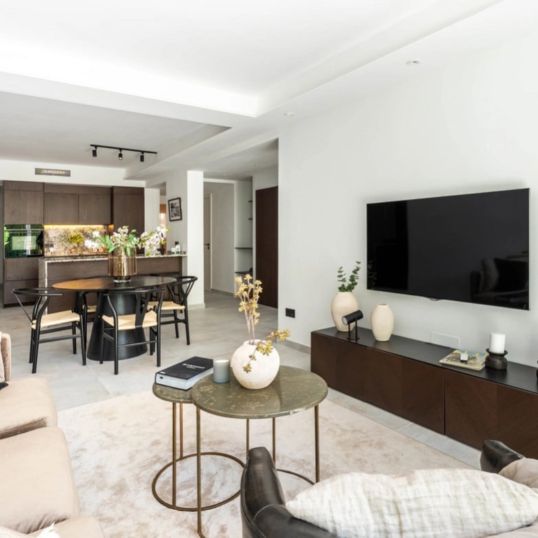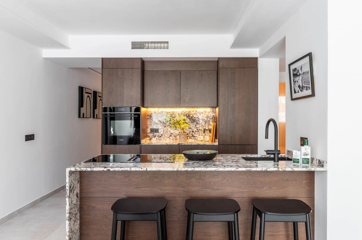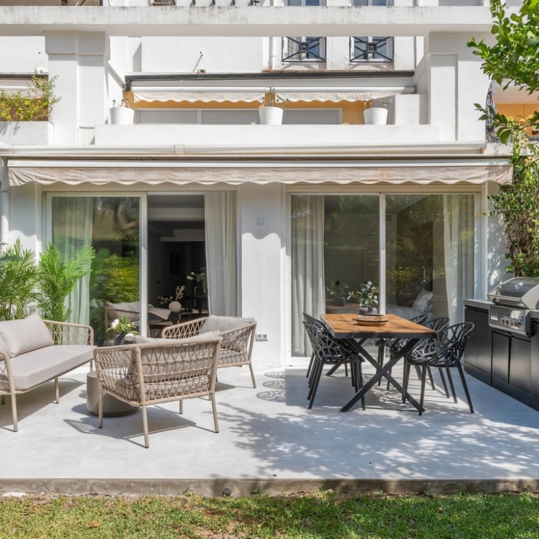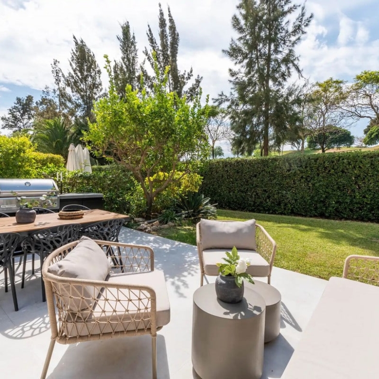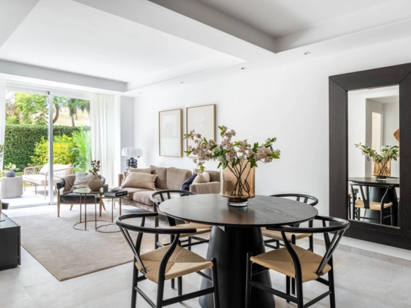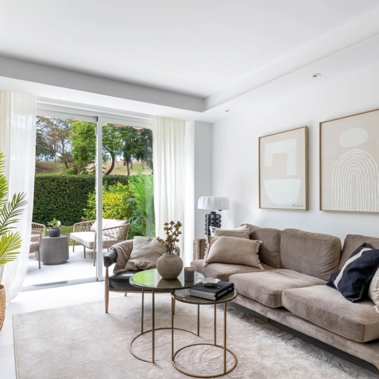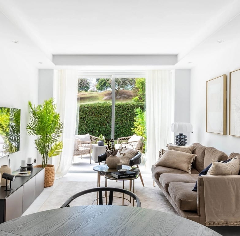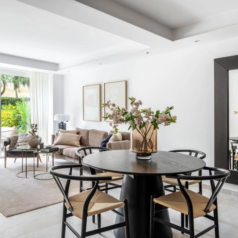 Welcome to this exquisite ground-floor apartment tucked away in the sought-after community of Las Terrazas de La Quinta. This beautifully designed and recently renovated three-bedroom residence offers a harmonious blend of modern simplicity and Scandinavian aesthetics, providing a serene and tranquil living environment. Upon entering, you’ll be greeted by a spacious layout with abundant natural light, complemented by underfloor heating and centralised air conditioning for year-round comfort. The open-plan living area flows seamlessly into a stylish kitchen, equipped with Siemens appliances, offering both functionality and elegance.