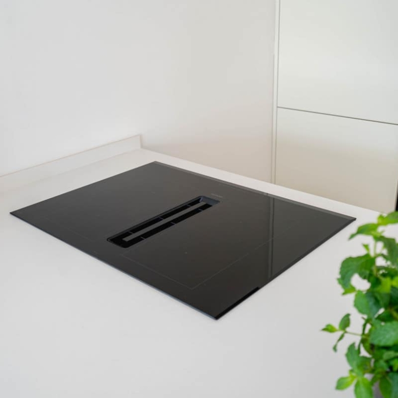 The open-plan kitchen seamlessly blends into the living spaces, creating an inviting atmosphere ideal for both relaxing and entertaining. Large windows bathe the interior in natural light, enhancing the indoor-outdoor feeling that extends to the spacious terrace facing south. From here, enjoy partial sea views and soak in the tranquility of the surroundings.