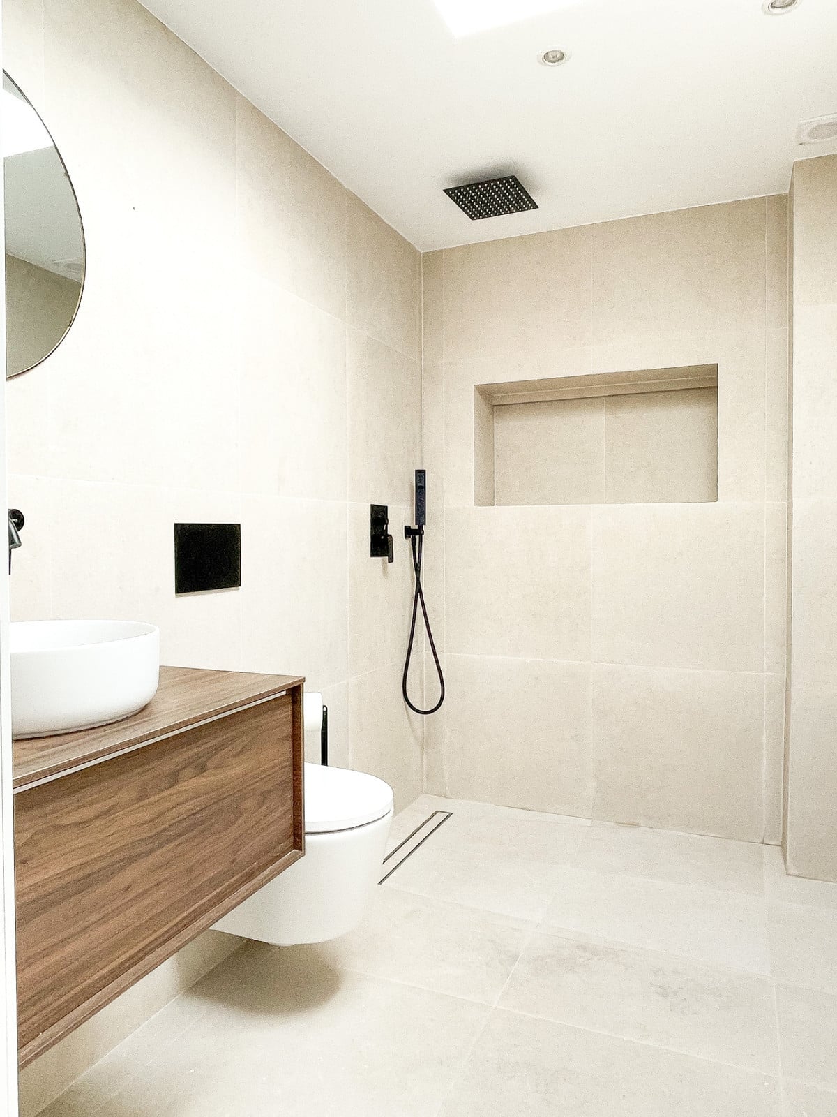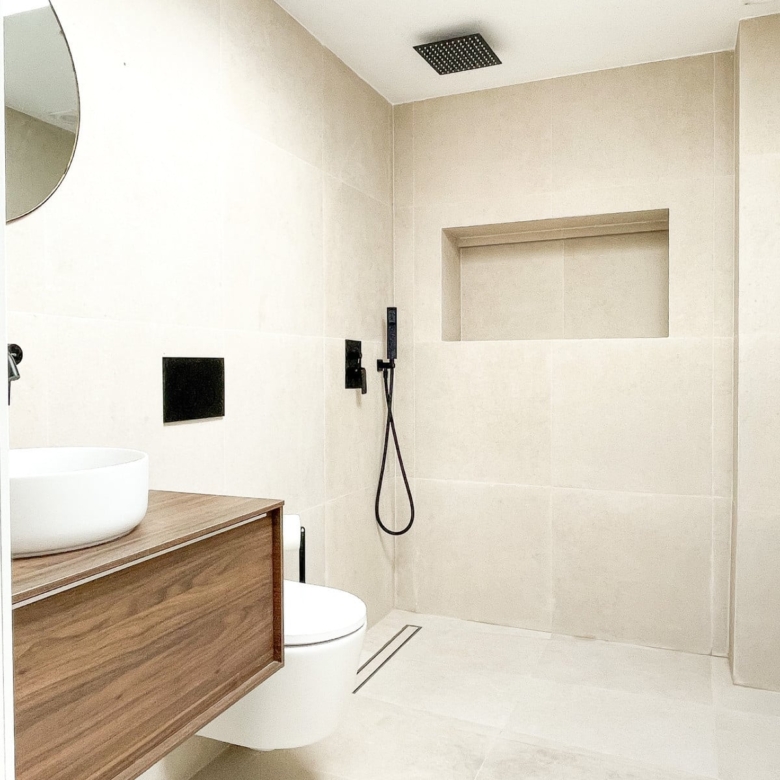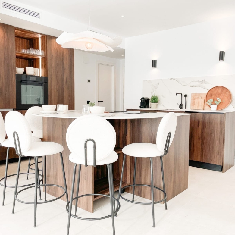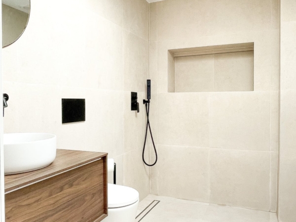 The property boasts a bespoke kitchen, a masterstroke of design artistry featuring a unique rounded island and top-tier Bertazzoni appliances. Consistent design elements flow throughout the residence with harmonizing 60×60 beige porcelain tiles adorning the floors, bathroom walls, and outdoor areas. Sleek black detailing and skylights in both bathrooms impart a sophisticated modern flair, ensuring a lifestyle of luxury bathed in sunshine.