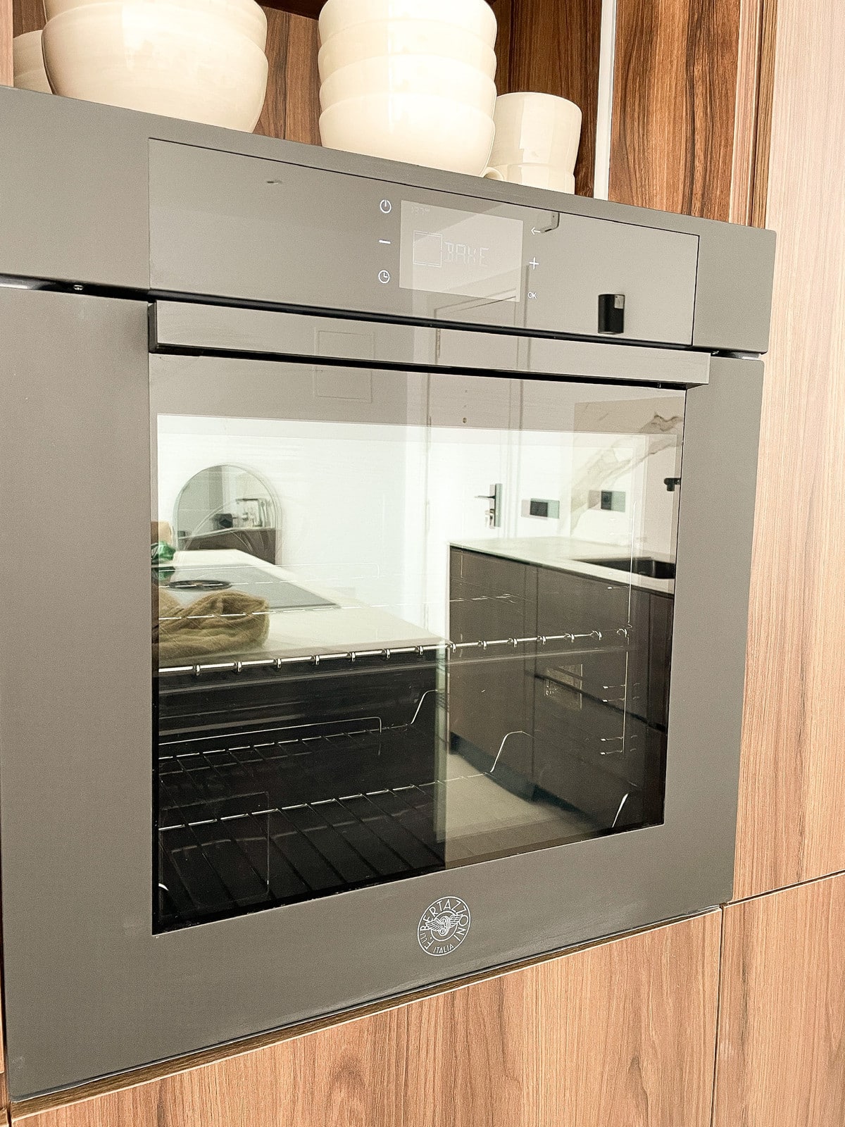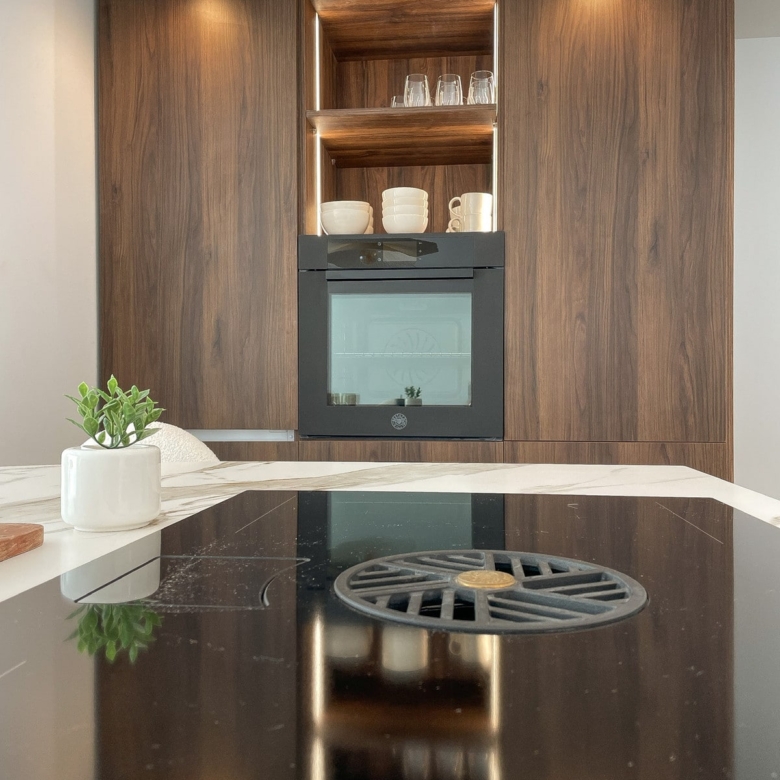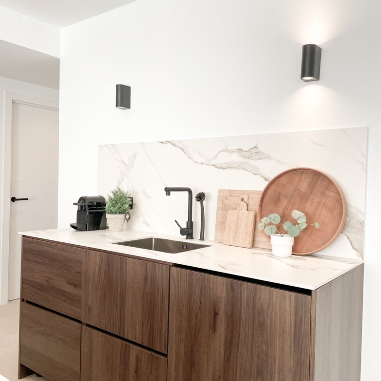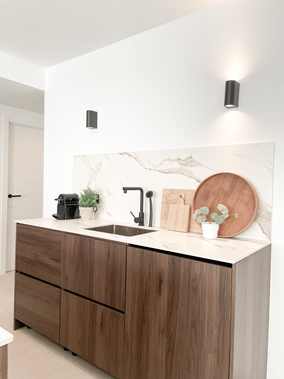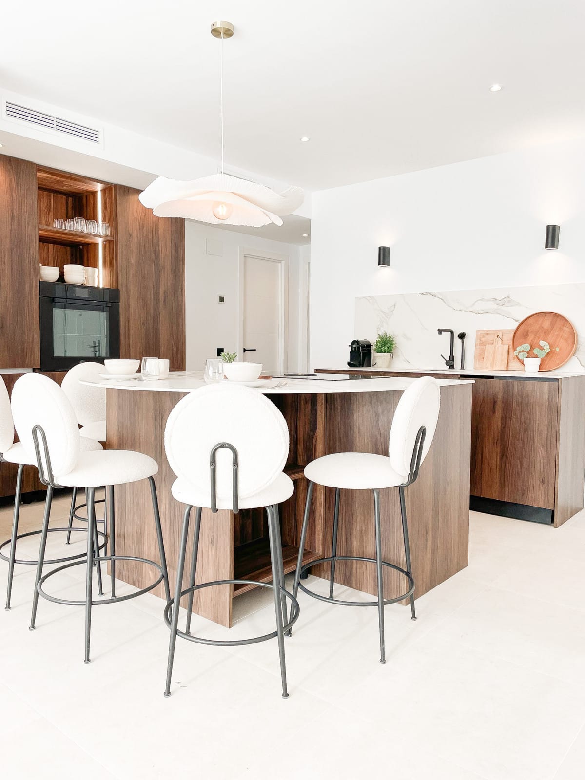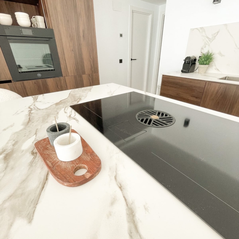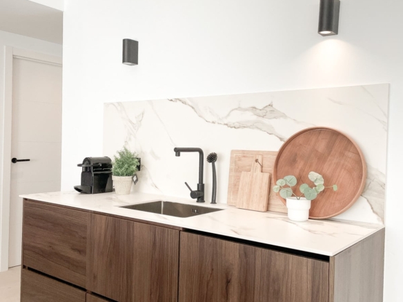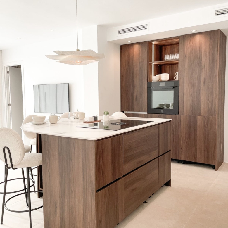 Handcrafted carpentry, kitchen cabinetry, wardrobes, and bathroom fittings are beautifully executed in rich walnut, while the flooring throughout glistens with artens 60×60 beige porcelain tiles. The kitchen and bathroom countertops shine in sturdy italian Calacatta porcelain, adding another touch of luxury to this distinguished dwelling.