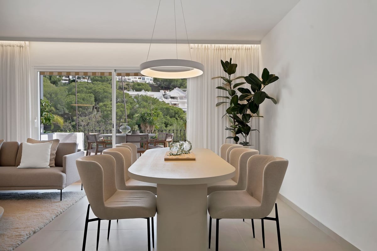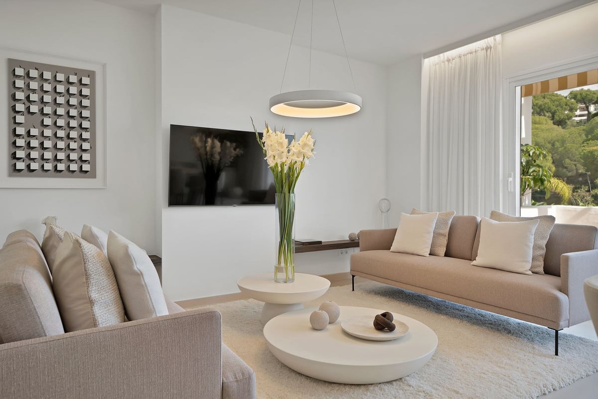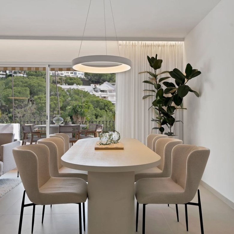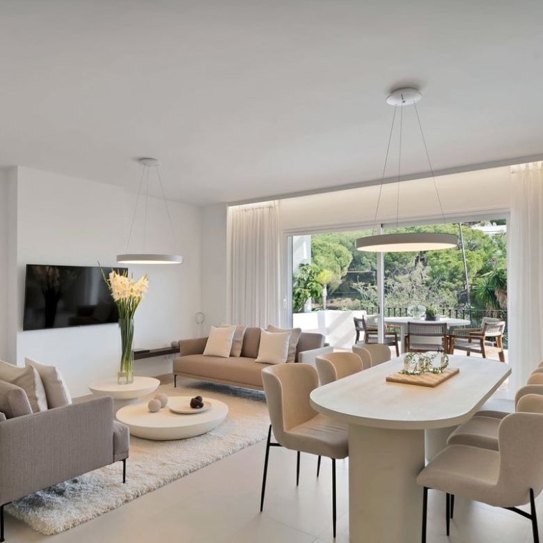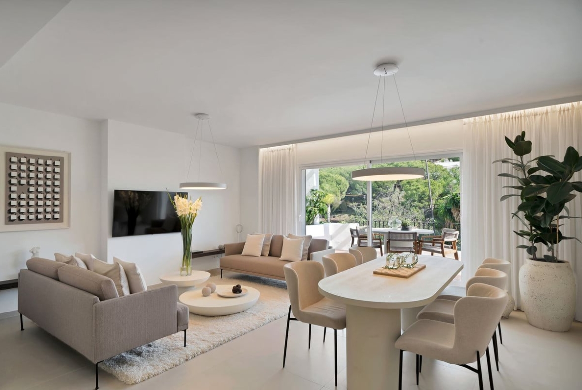 The spacious living room, opens onto a terrace that offers a serene relaxation area and an outdoor dining space, perfect for al fresco living. Expansive glass doors flood the living and dining area with natural light and offer picturesque views of the surroundings.