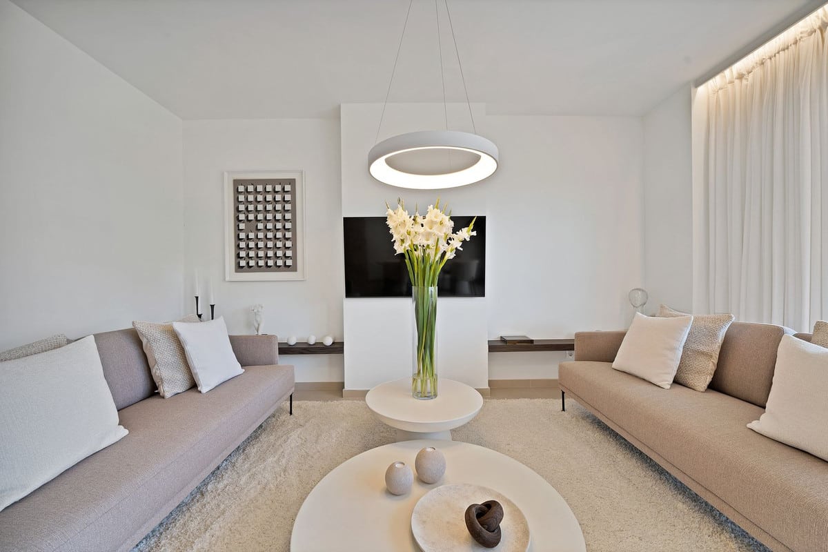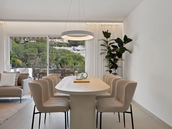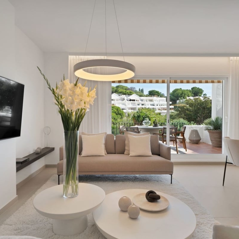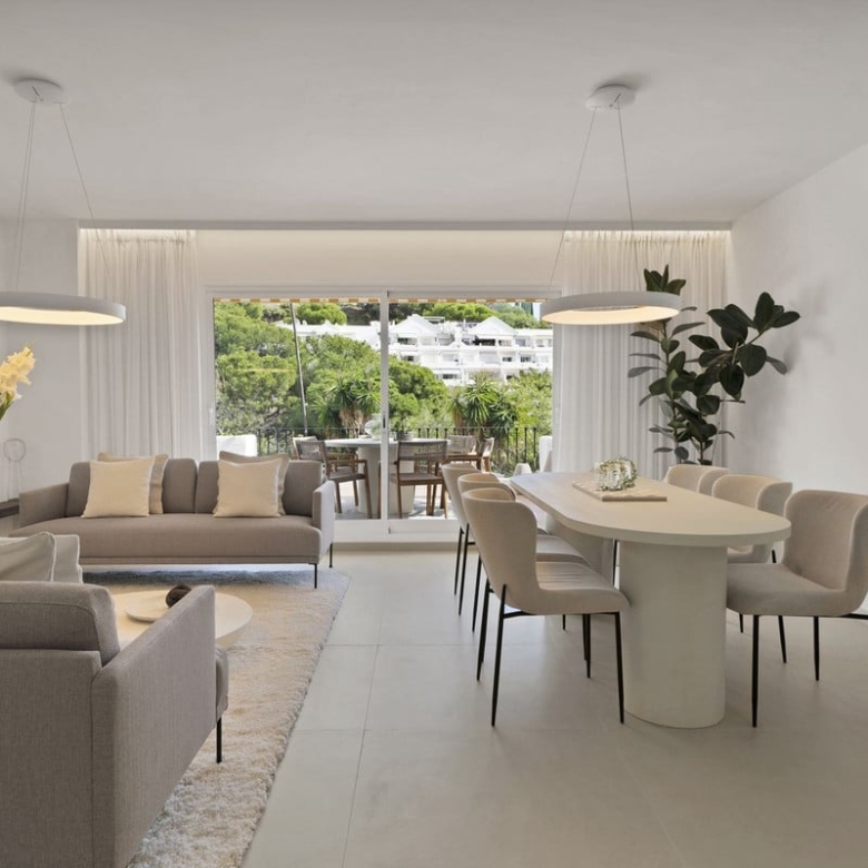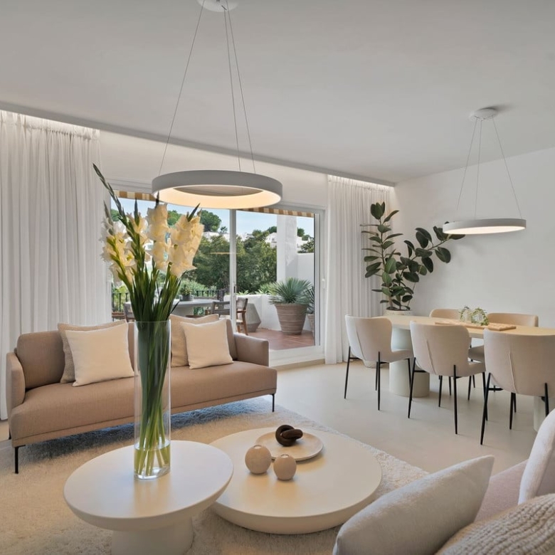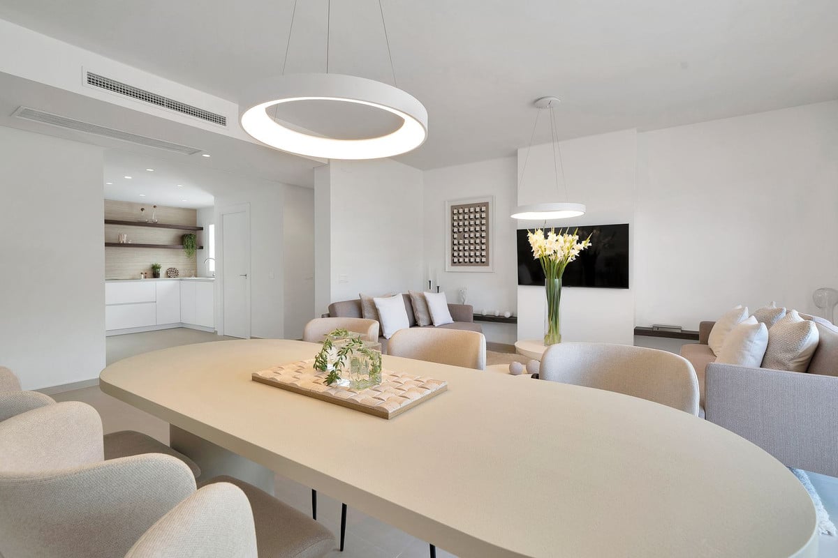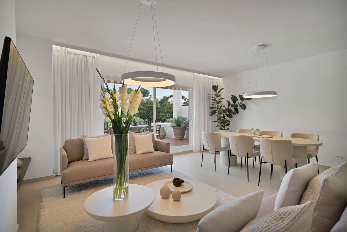 The spacious living room, opens onto a terrace that offers a serene relaxation area and an outdoor dining space, perfect for al fresco living. Expansive glass doors flood the living and dining area with natural light and offer picturesque views of the surroundings.