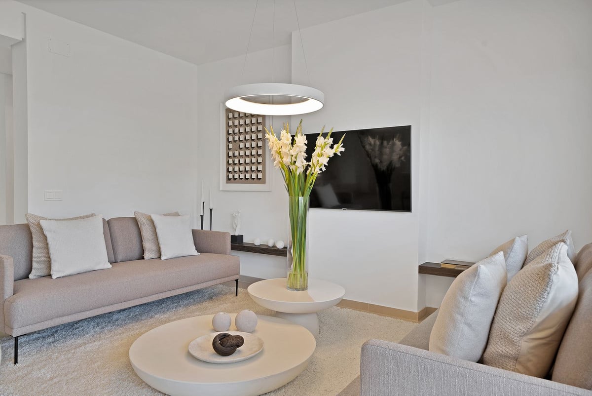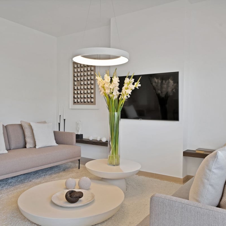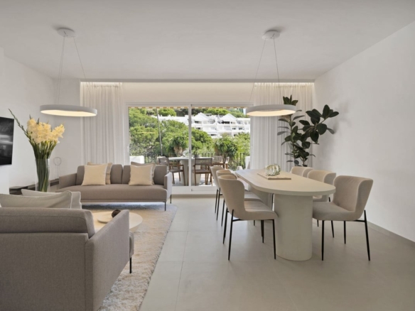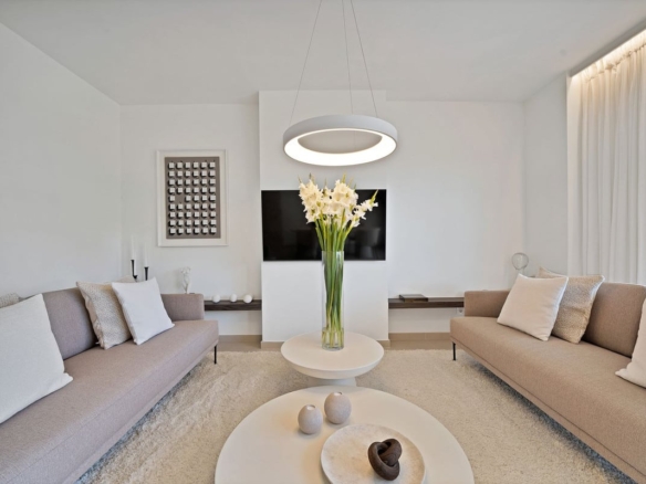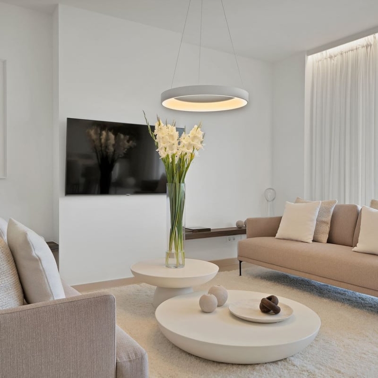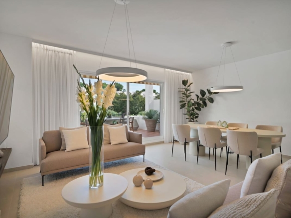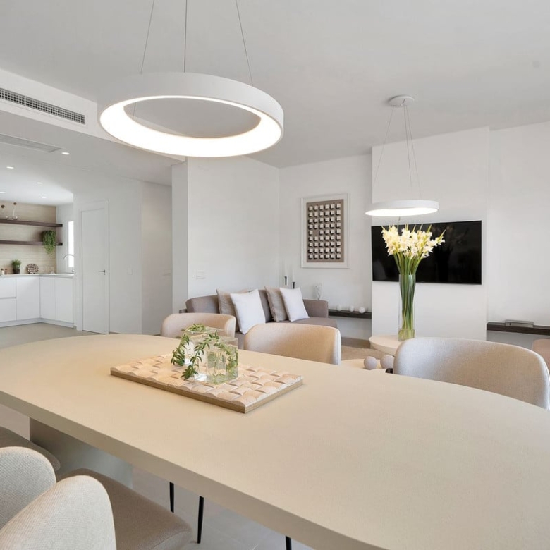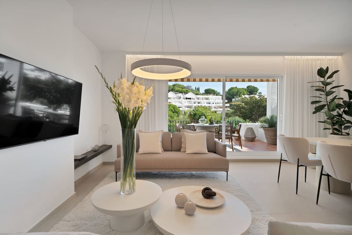 The spacious living room, opens onto a terrace that offers a serene relaxation area and an outdoor dining space, perfect for al fresco living. Expansive glass doors flood the living and dining area with natural light and offer picturesque views of the surroundings.