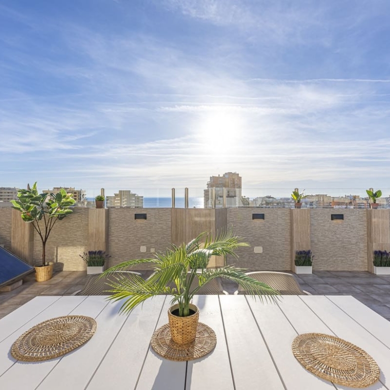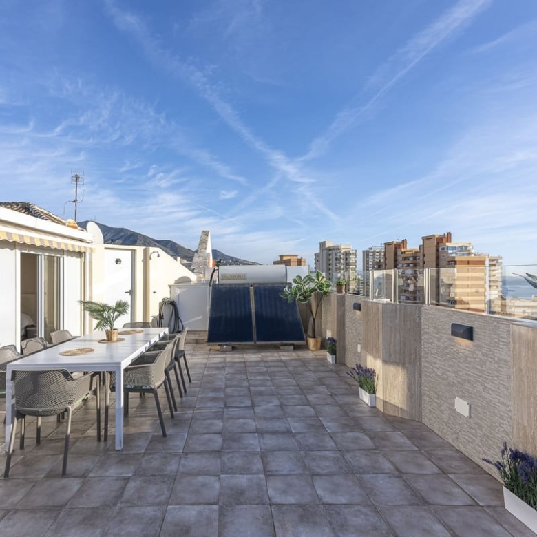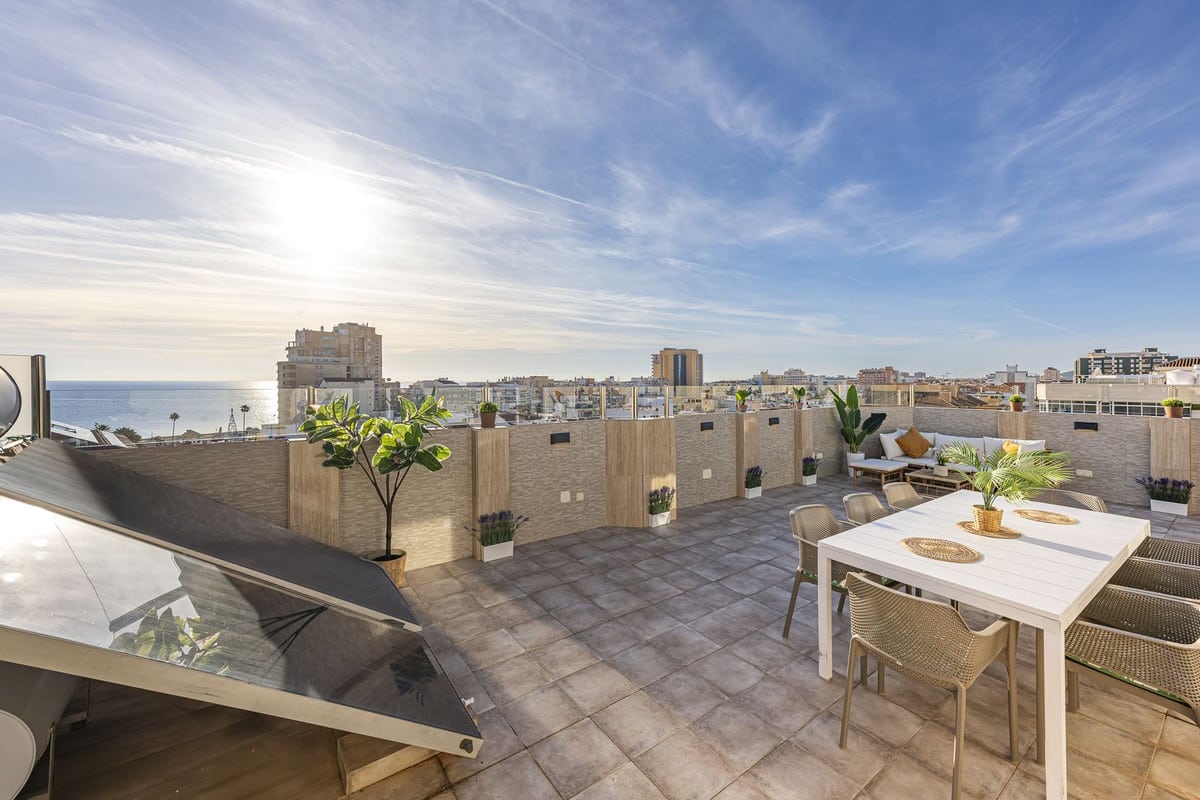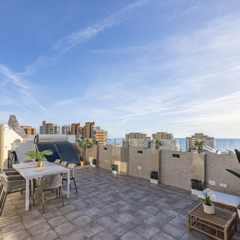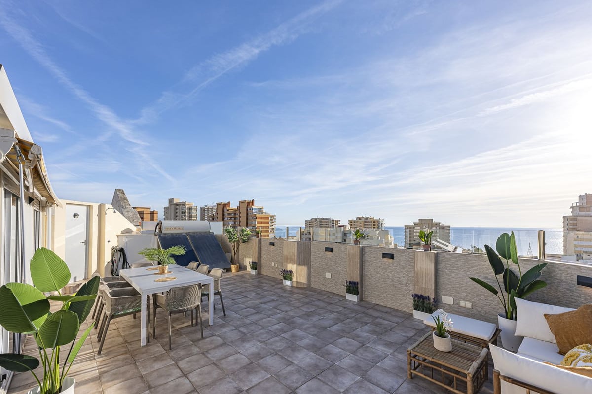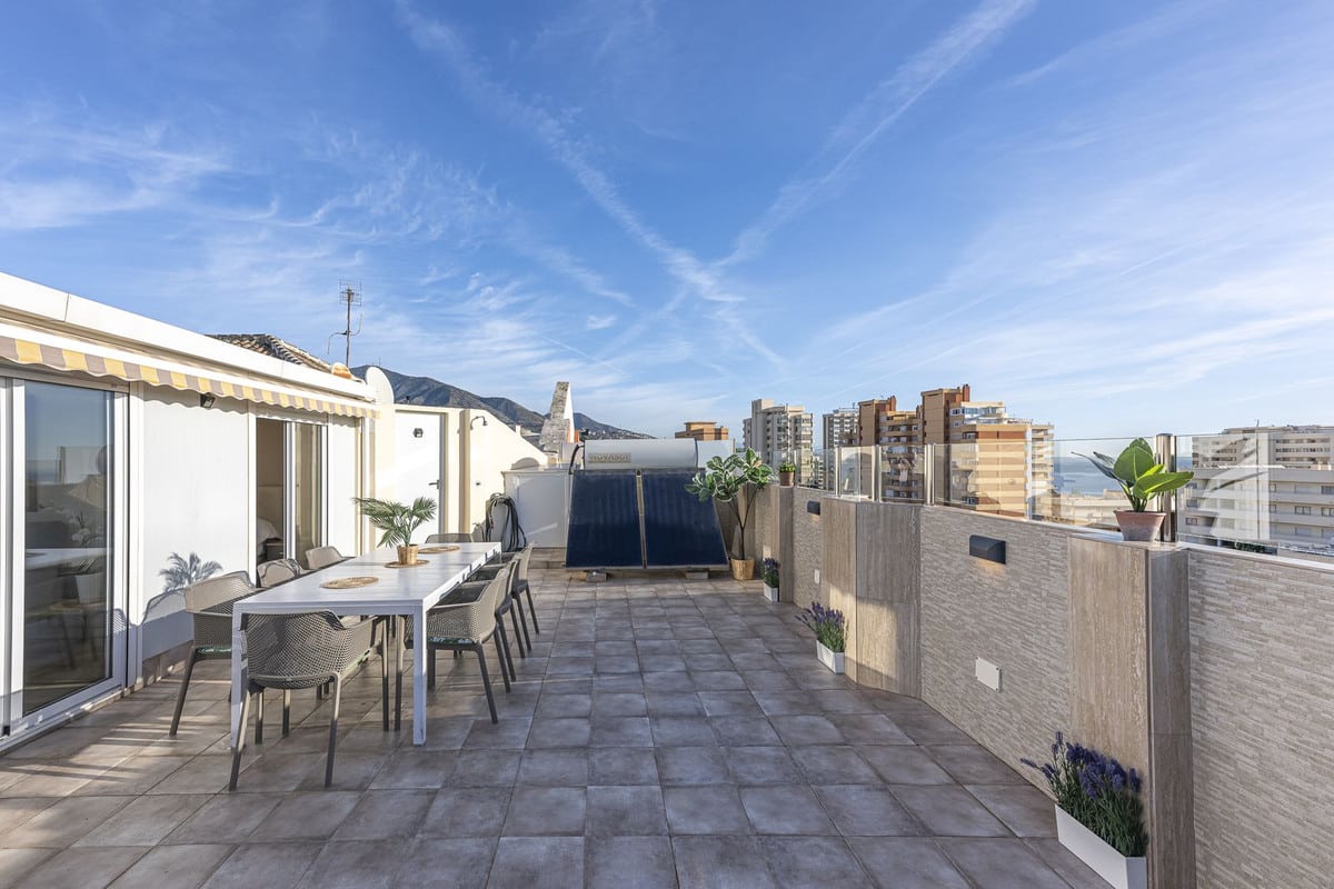 Exclusive opportunity in Los Boliches! An impressive penthouse for sale ideal for those seeking luxury and comfort in a privileged location. This wonderful penthouse is distributed over two floors. The first floor consists of a spacious living-dining room with direct access to the spacious glazed terrace, ideal for enjoying the wonderful views at any time of the year. Modern kitchen with central island fully equipped with state-of-the-art appliances integrated into the living room, forming a single space. it has two spacious and bright rooms perfect for resting, one of them with a beautiful and practical dressing room. Two bathrooms with shower and double sink in a contemporary and elegant style. Private access with direct elevator to the upper floor where you can enjoy a spacious solarium with areas for sunbathing, outdoor dining and spectacular views. Large and sunny living room with kitchenette, bright double bedroom and modern bathroom with shower. This penthouse is located in a gated community that offers maximum security and tranquility. it also has a community pool to enjoy the good weather. Don’t miss this unique opportunity to live in a dream penthouse in Los Boliches!