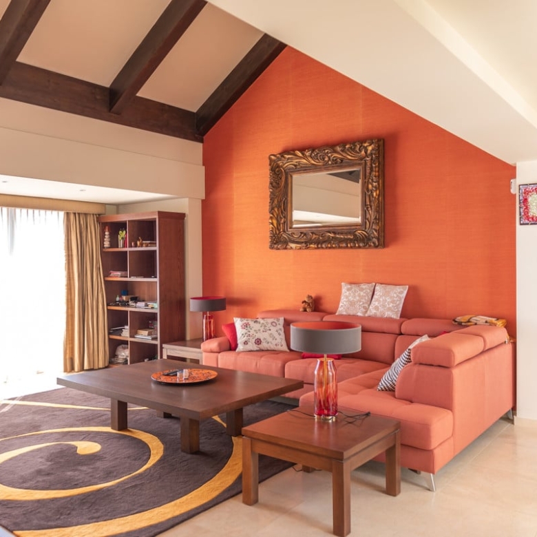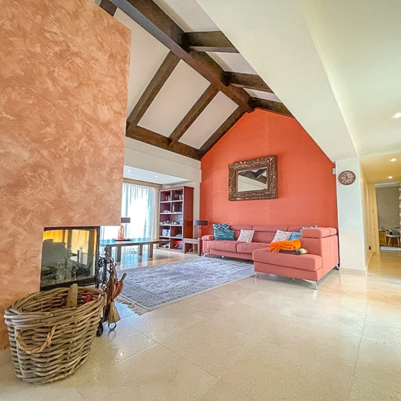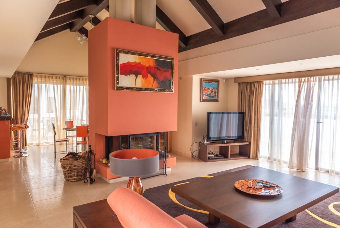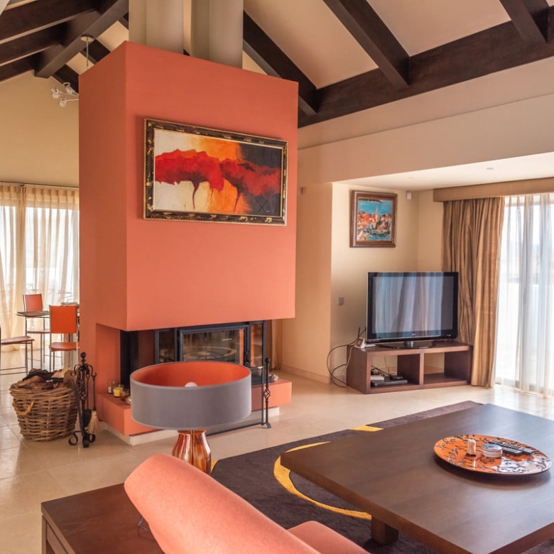 it has a wonderful and spacious living room, accompanied by a fireplace and a dining area.