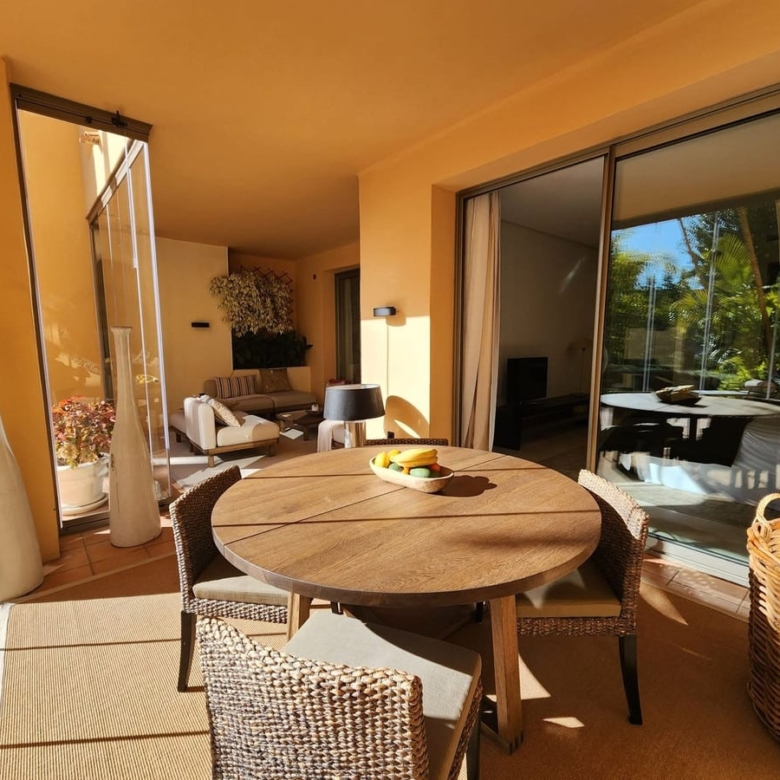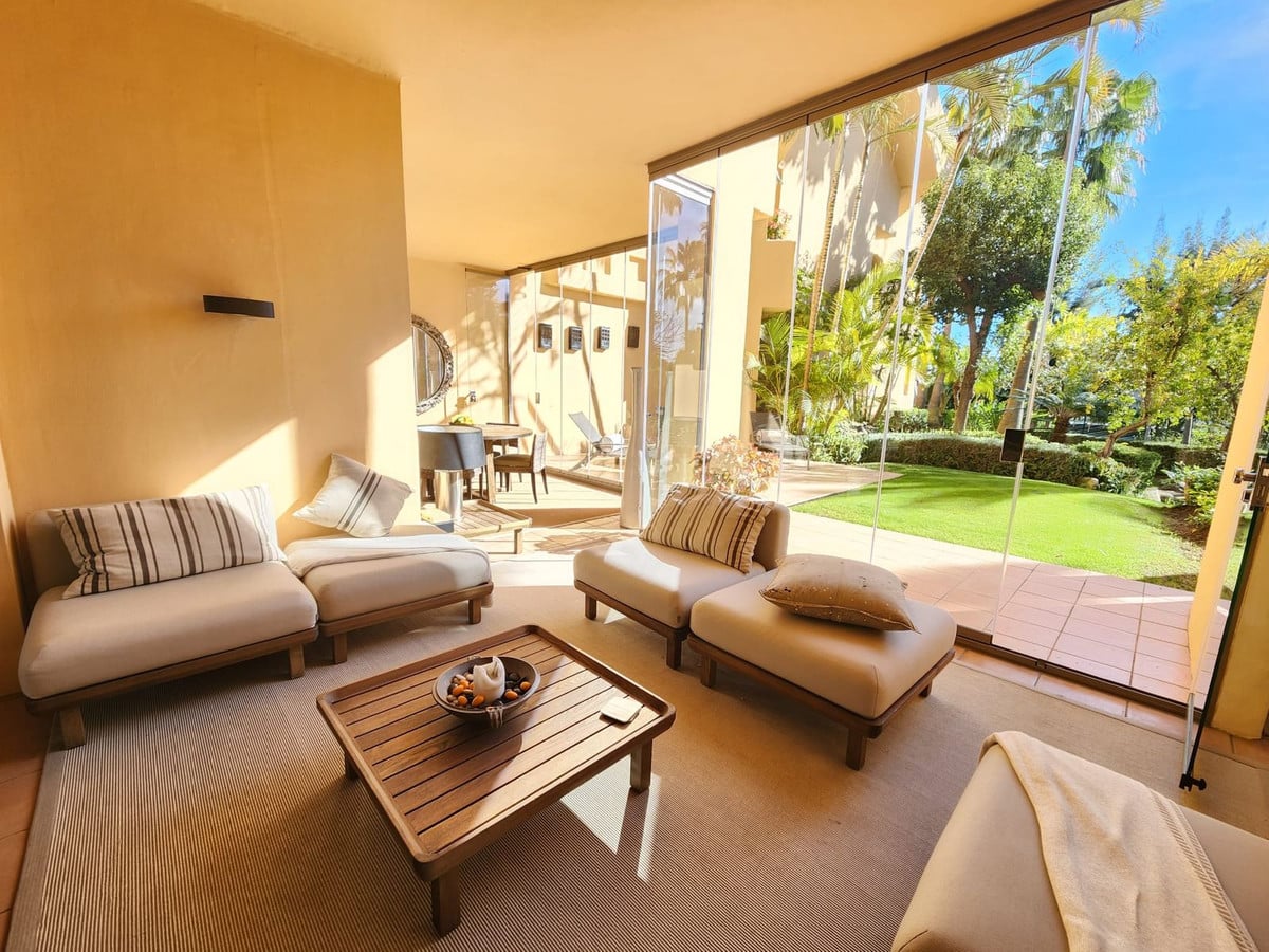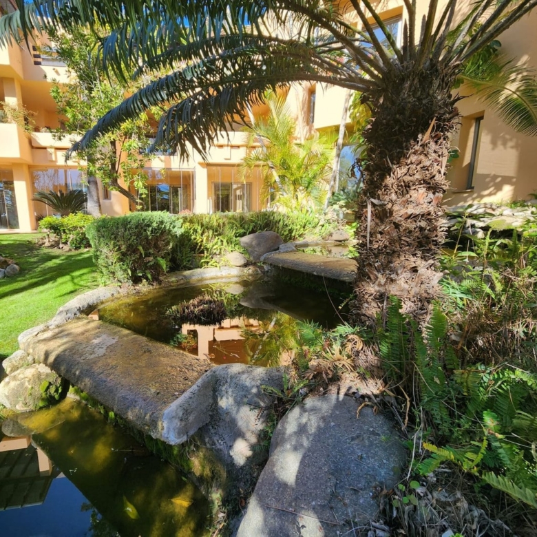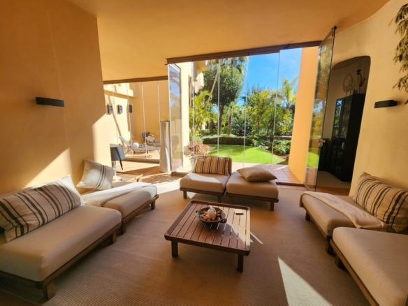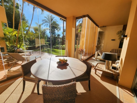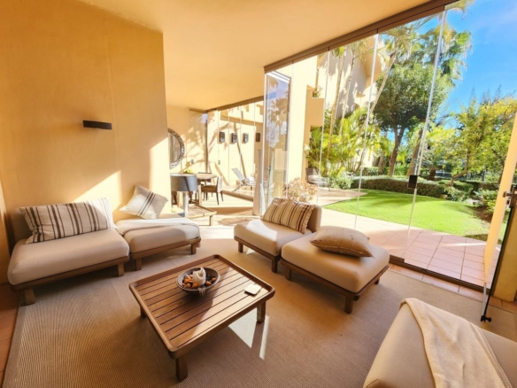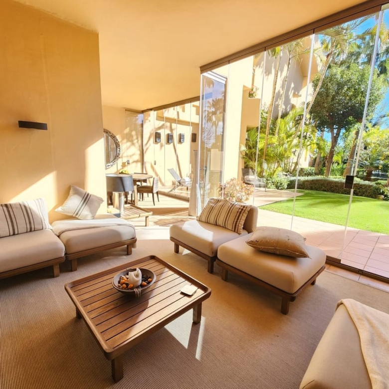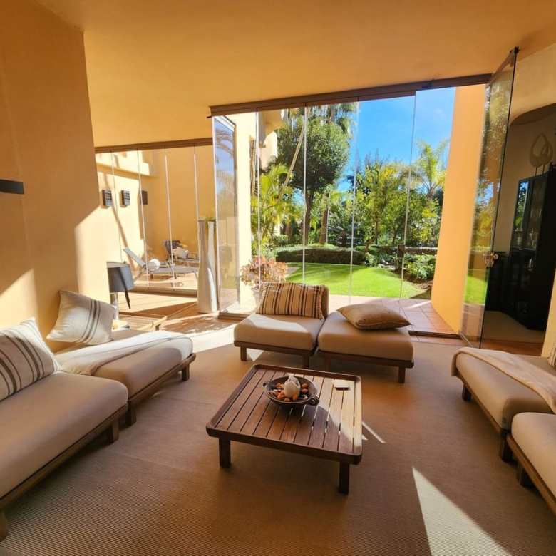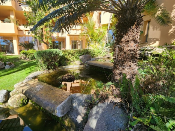 Enter into the apartment to a real sensation of luxury and space, you have on the left a new refurbished American style kitchen with with breakfast bar, large sitting/dining room which leads out to a bright sunny terrace with glass curtains so this creates another large sitting and dining room area which is so cosy in the winter and cool in the summer. This leads out to another part of the terrace al fresco and garden where you can sunbath w sound of thith the background noise of the little stream/water feature in the garden area so makes it even more relaxing.