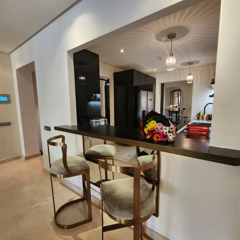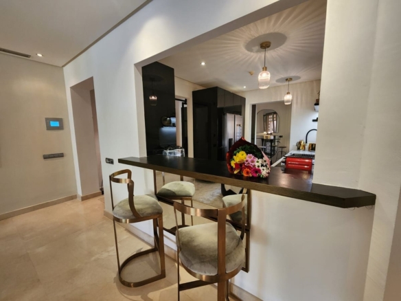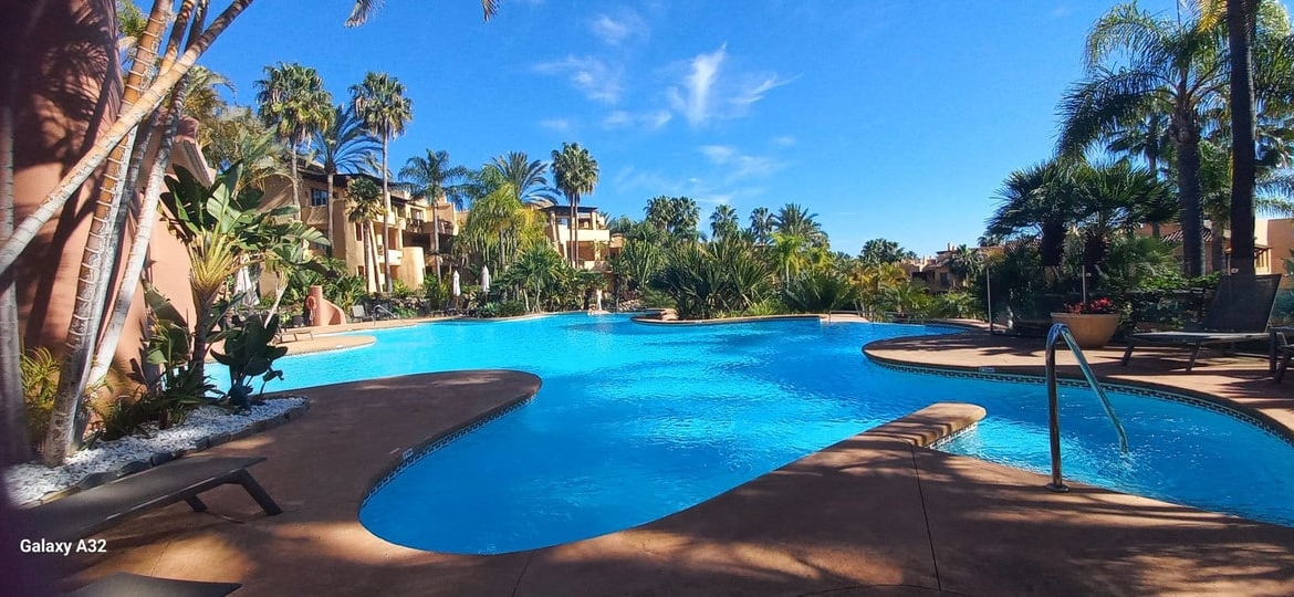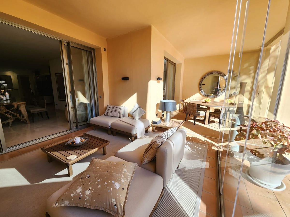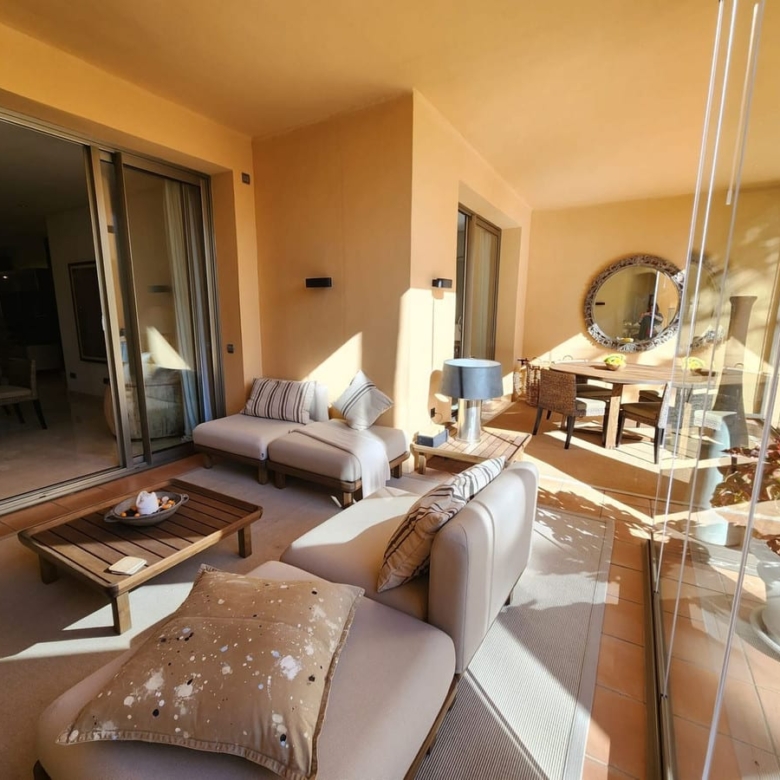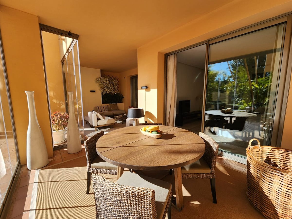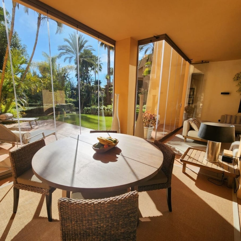 Enter into the apartment to a real sensation of luxury and space, you have on the left a new refurbished American style kitchen with with breakfast bar, large sitting/dining room which leads out to a bright sunny terrace with glass curtains so this creates another large sitting and dining room area which is so cosy in the winter and cool in the summer. This leads out to another part of the terrace al fresco and garden where you can sunbath w sound of thith the background noise of the little stream/water feature in the garden area so makes it even more relaxing.