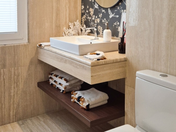 A modern staircase takes us to the second floor, where there is another bedroom, a full bathroom, a wardrobe area, and a large master bedroom with a dressing area and a full bathroom, all with access to the large terrace with views.