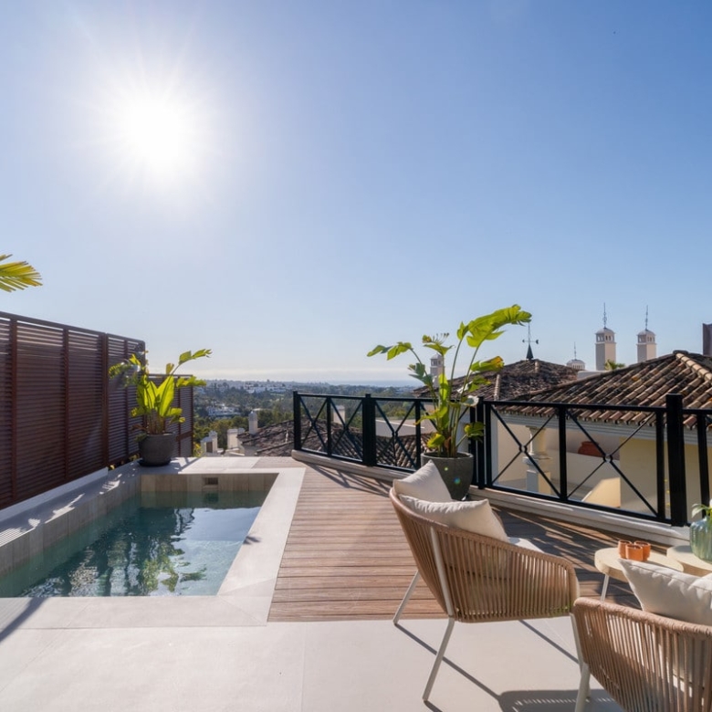 A standout feature of this home is its private swimming pool, located on a lovely terrace that showcases panoramic views of the beautiful La Concha mountain and the Mediterranean Sea. This idyllic outdoor space is perfect for year-round enjoyment, whether it’s relaxing by the pool, hosting al fresco dinners, or simply soaking in the spectacular scenery.