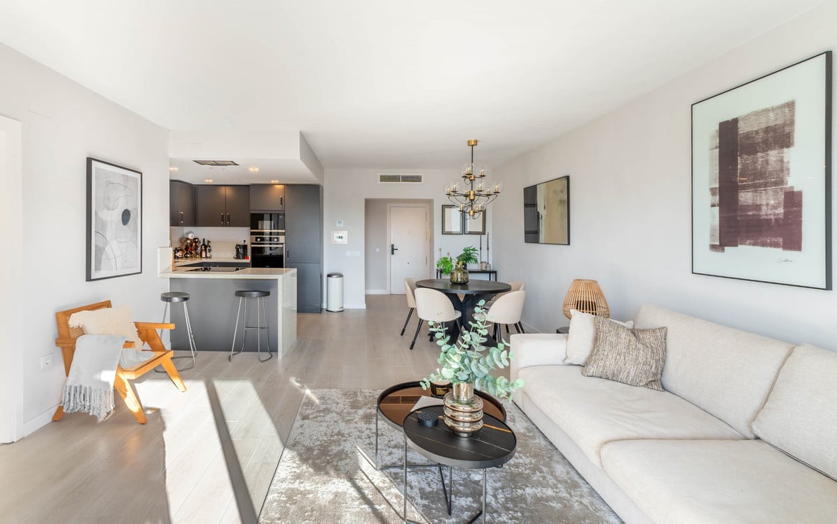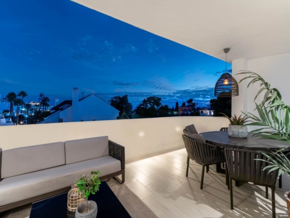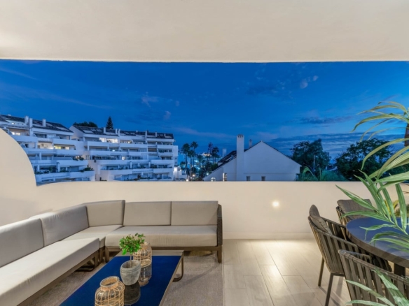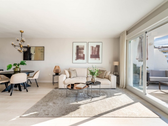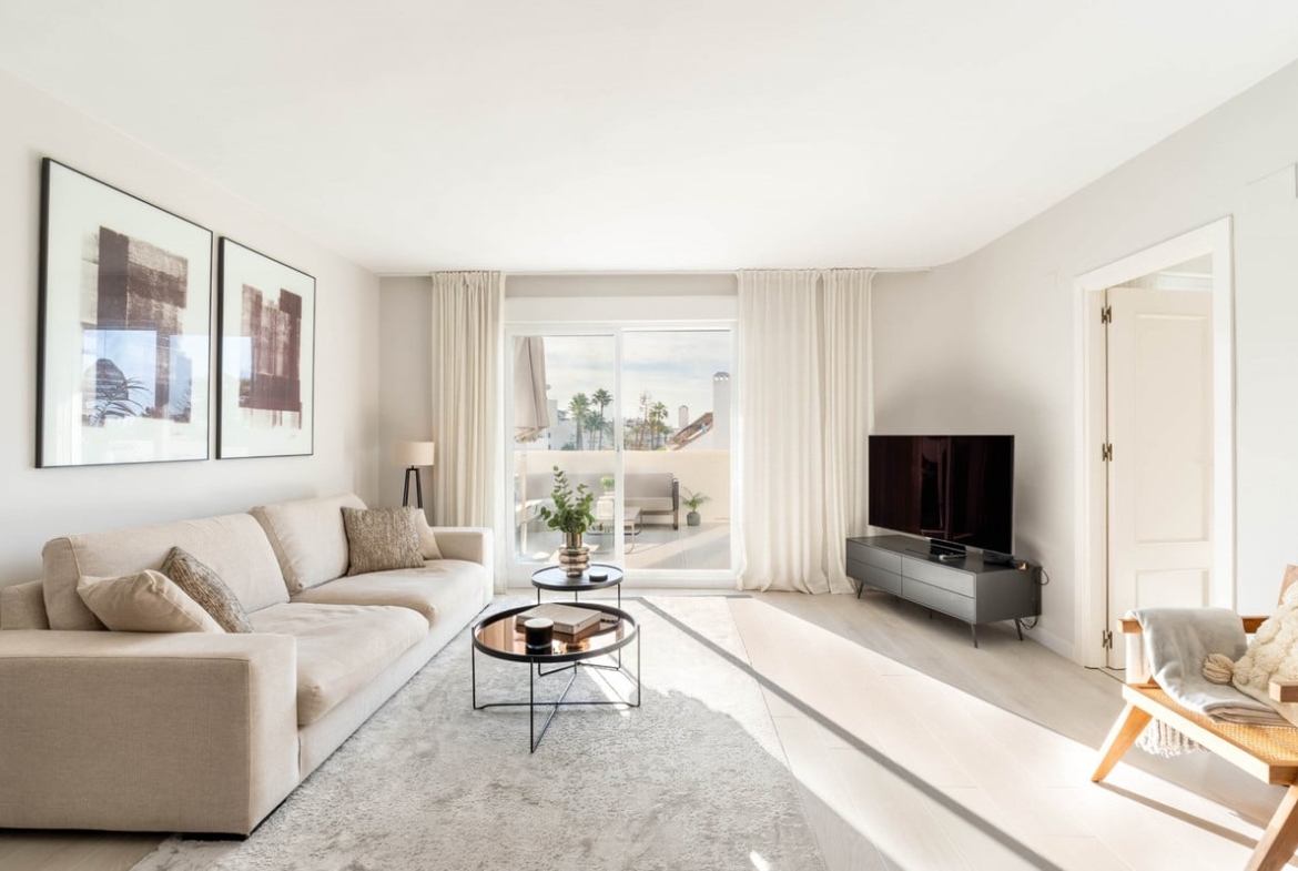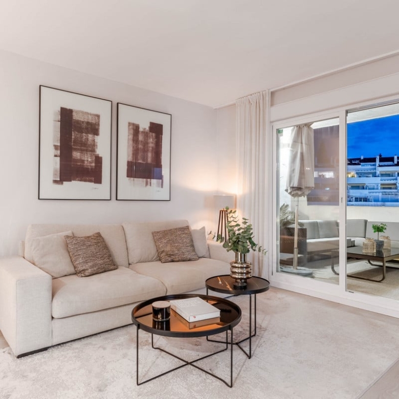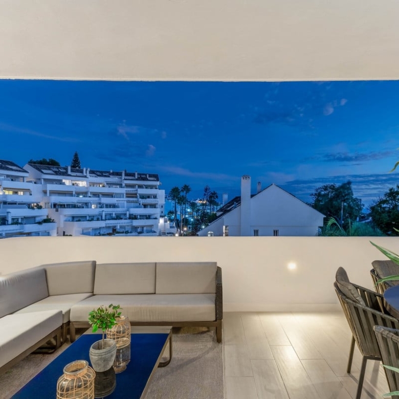 Welcome to this elegantly renovated residence in Nueva Andalucia. Located in a delightful community, this stunning three-bedroom, two-bathroom apartment boasts a modern, open-plan layout with Scandinavian-styled interiors and a south-facing terrace that captures natural sunlight throughout the day and showcases serene partial sea views.