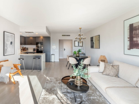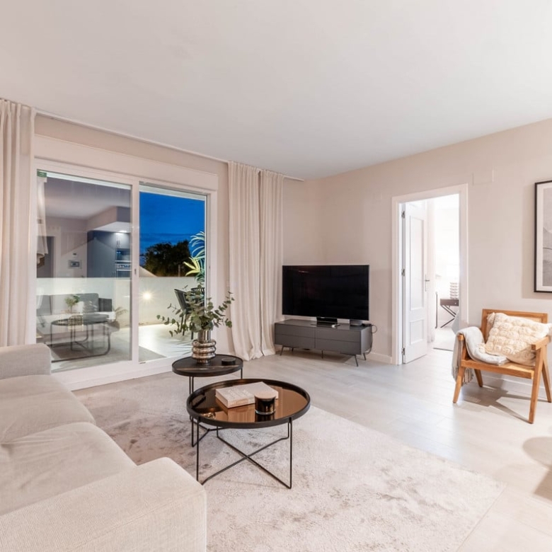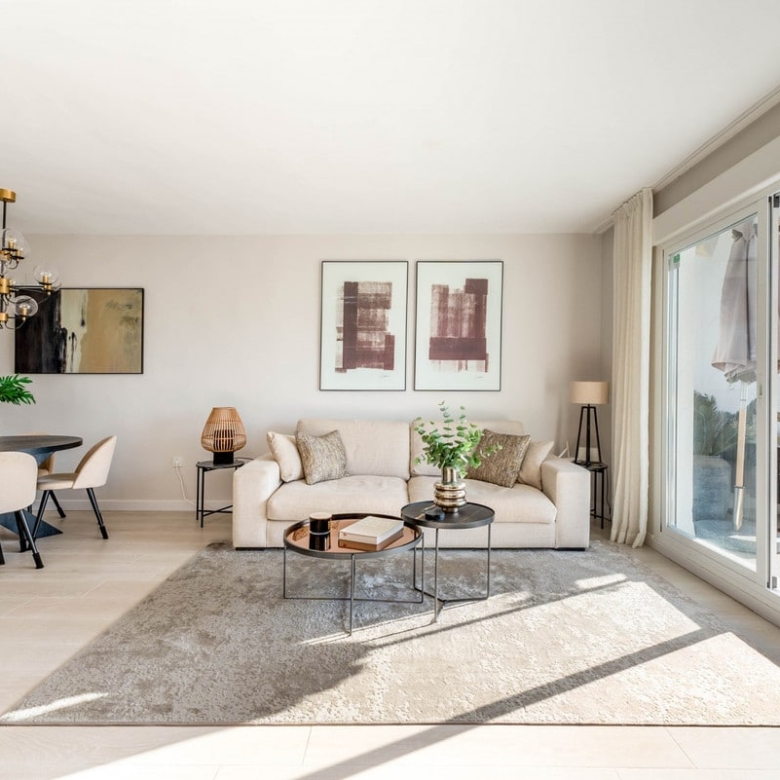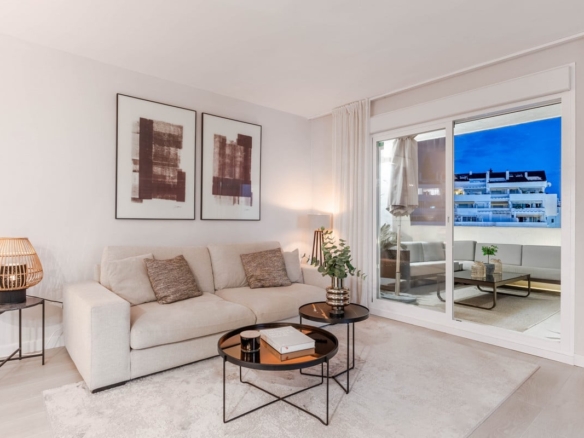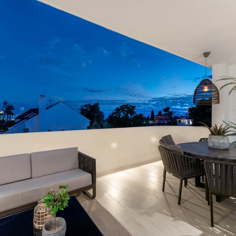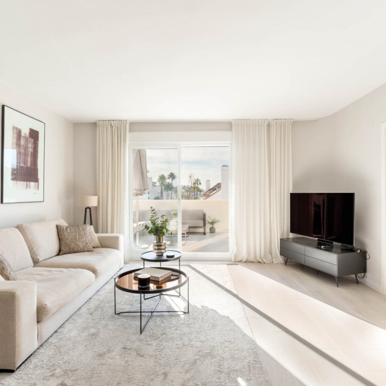 Welcome to this elegantly renovated residence in Nueva Andalucia. Located in a delightful community, this stunning three-bedroom, two-bathroom apartment boasts a modern, open-plan layout with Scandinavian-styled interiors and a south-facing terrace that captures natural sunlight throughout the day and showcases serene partial sea views.
