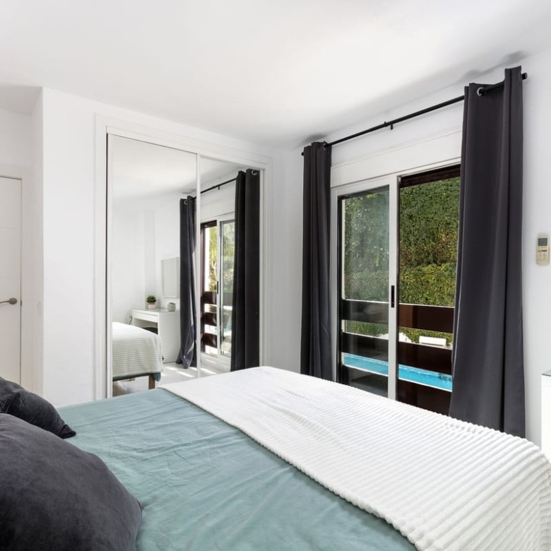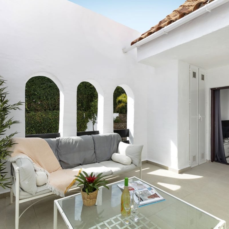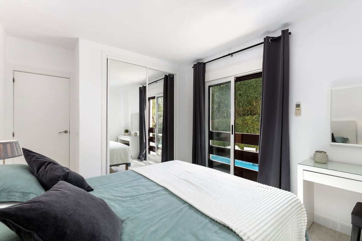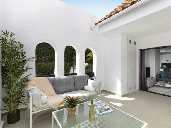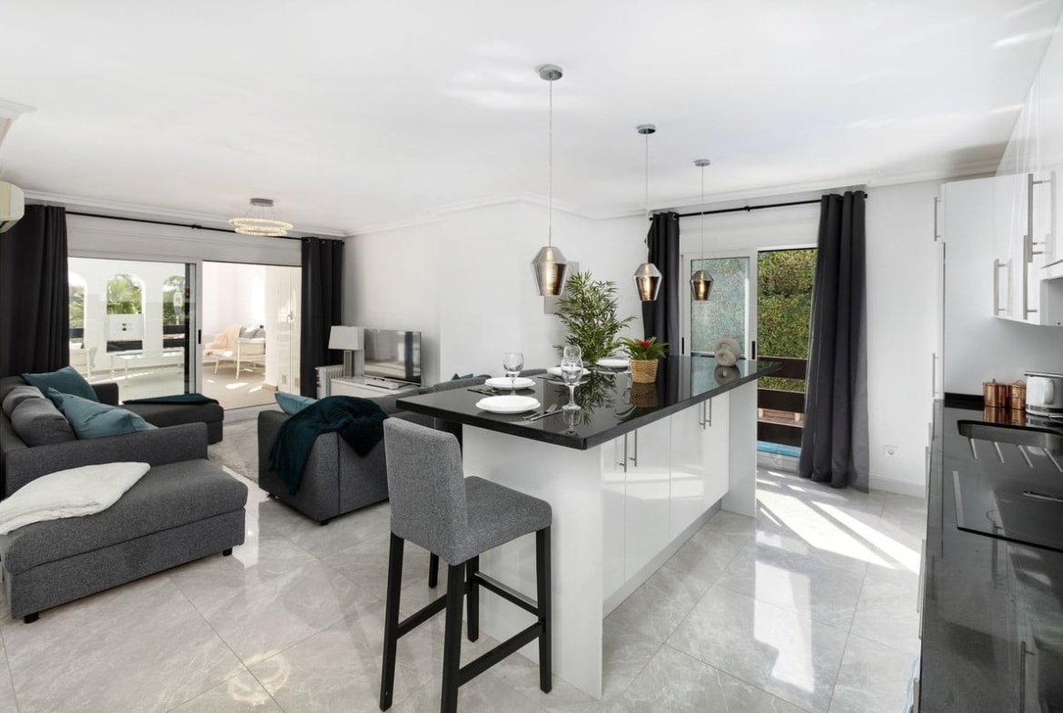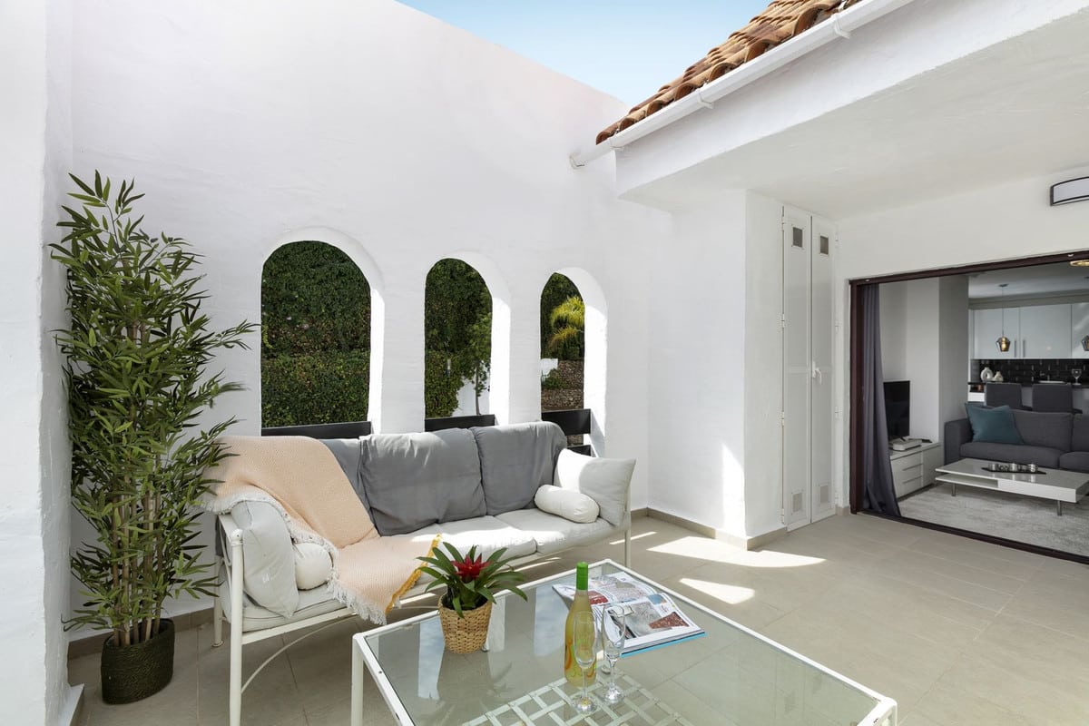 Nicely refurbished, quite unique first floor apartment in Nueva Andalucia. A closed luxury development with 24 hours security, well maintained gardens with 3 pools (one of them heated). Nice terrace next to the pool for alfresco dining. The most popular shops and restaurants on your doorstep and only a 15 minute walk to Puerto Banus and the beach.